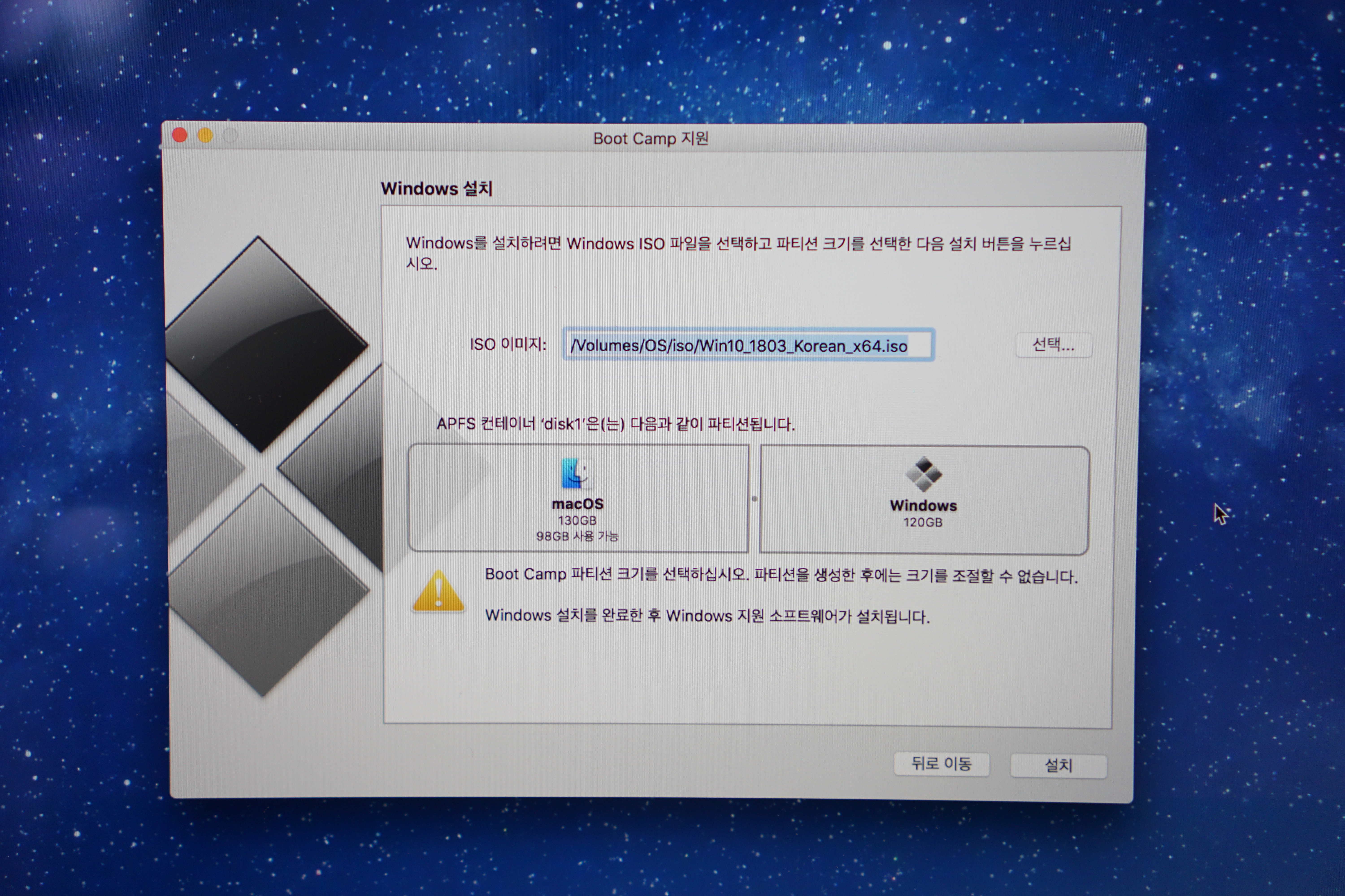파티션 생성이 완료되면, 윈도우 10 설치를 시작해야 합니다. 윈도우 10 설치 USB를 삽입한 후, 맥북을 재시작하여 부팅 디스크를 선택하고 설치를 진행합니다.