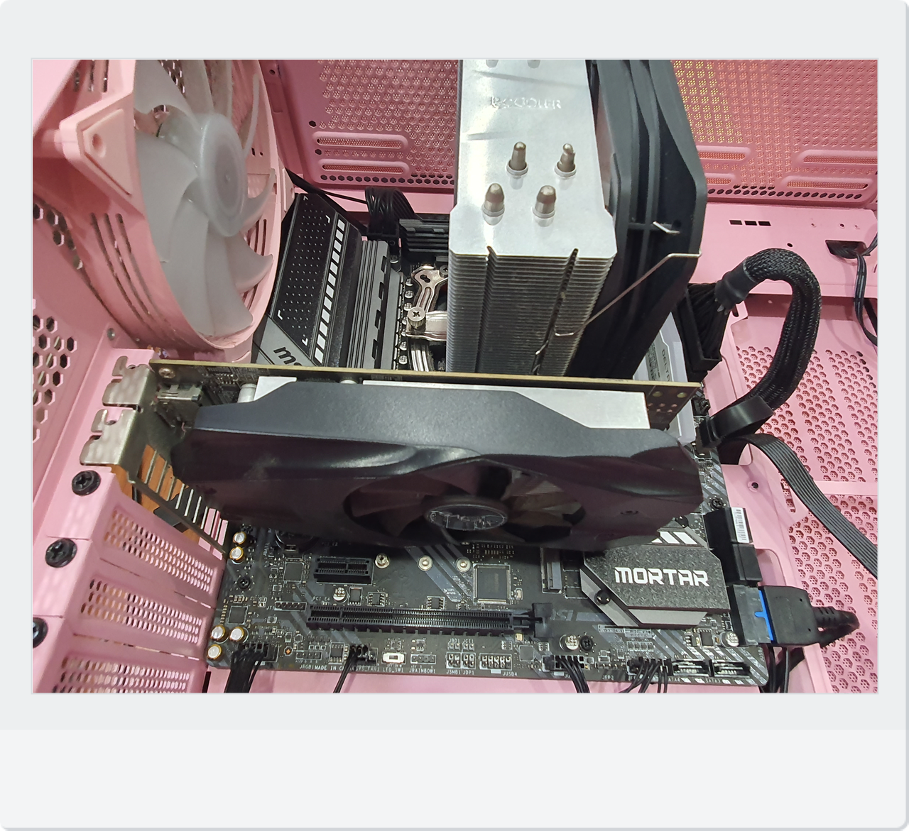 결국 메인보드에 결함이 있다는 결론이 내려졌고, 고객님의 사용 목적에 맞춰서 ASUS B550M-PLUS 모델로 교체 작업을 진행하기로 결정했습니다. 몇 년 전부터 AMD 라이젠 CPU를 쓰시는 분들이 늘어나면서, 호환성이 좋은 B550 칩셋 메인보드를 찾는 경우가 많아졌는데요. 이번에도 재고가 있었던 터라, 교체 작업을 금세 마칠 수 있었습니다. “아래 사진”을 보시면, 핑크색 케이스 내부에 새 메인보드를 장착한 직후 모습과, “테스트 영상”으로는 교체 후 정상 부팅 과정을 직접 확인하실 수 있을 겁니다.