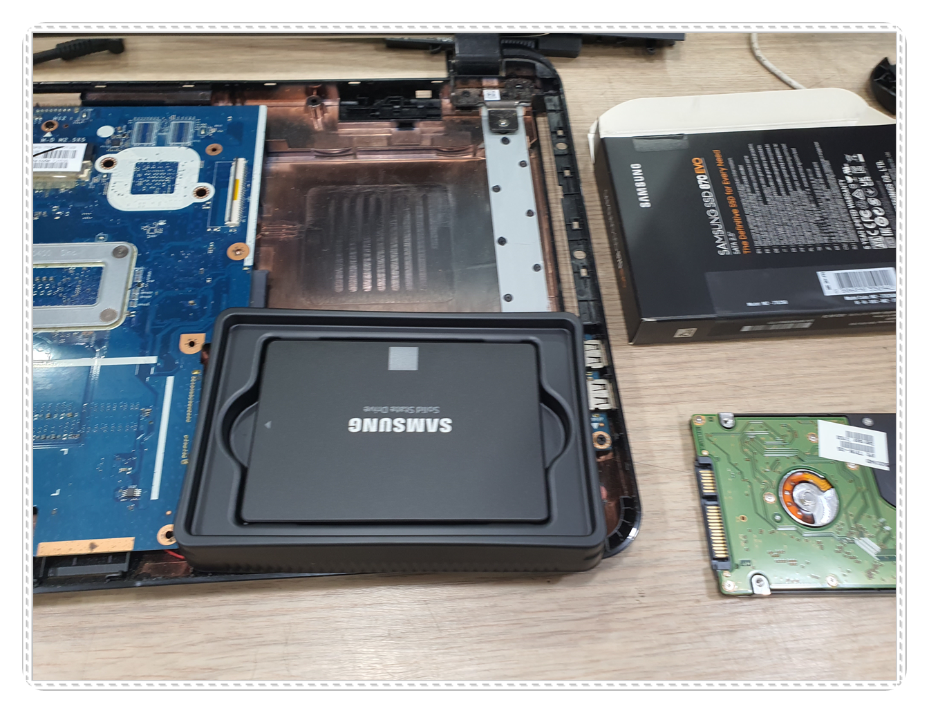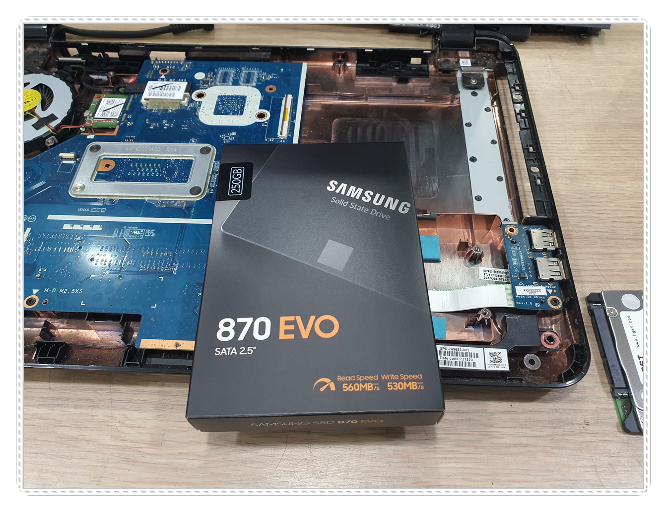 그래서 몇 가지 모델 정보를 여쭤본 뒤, 기존 하드디스크(HDD)를 삼성 SSD EVO 870 제품으로 교체하면 충분히 속도 향상을 기대할 수 있다고 안내해드렸습니다.