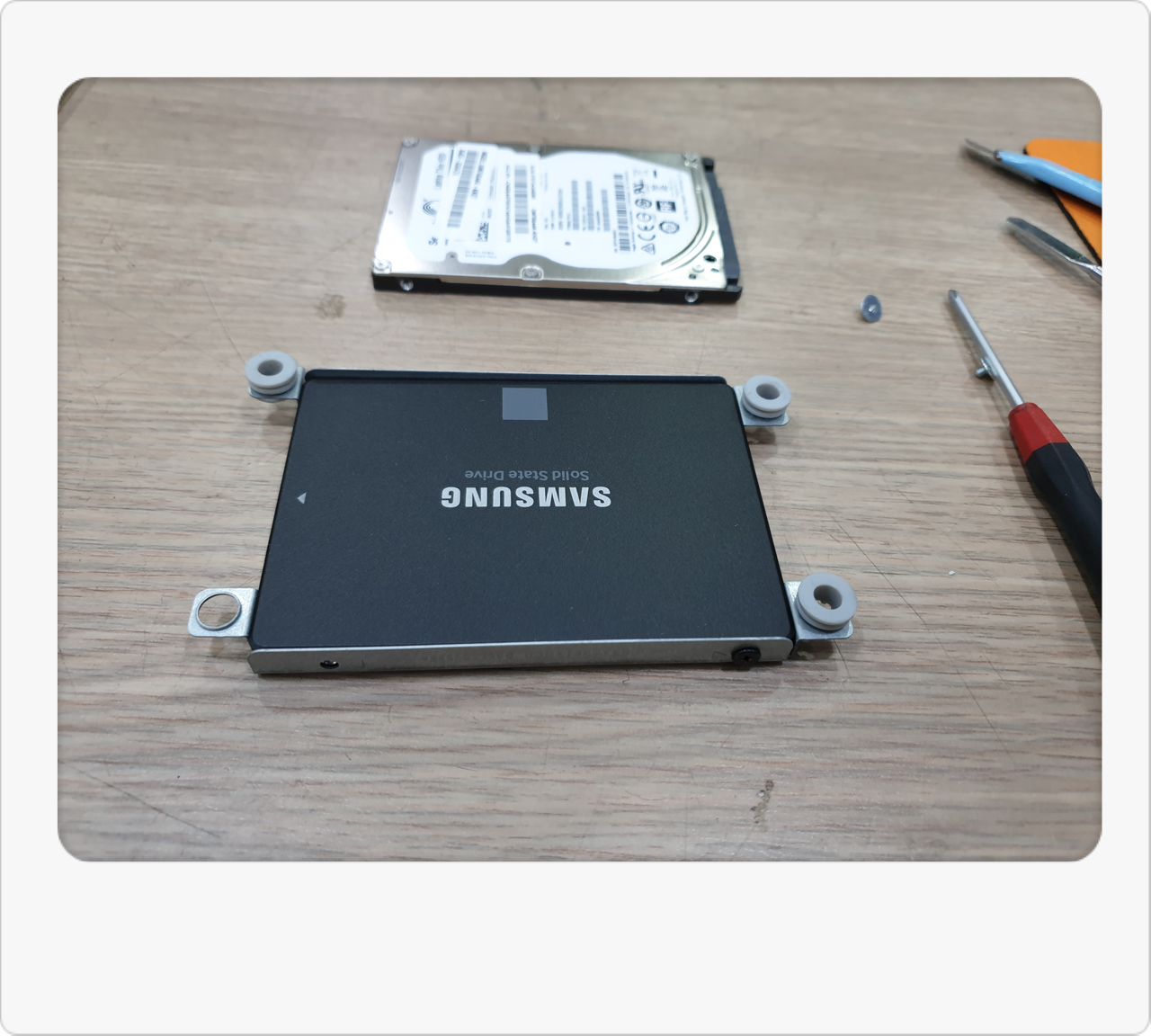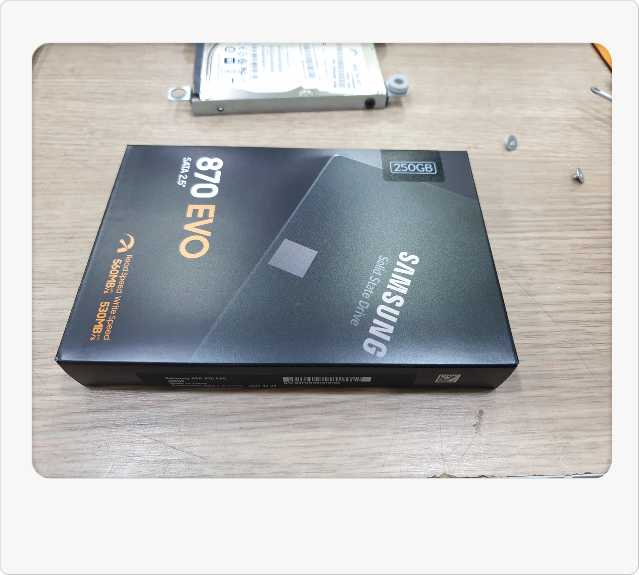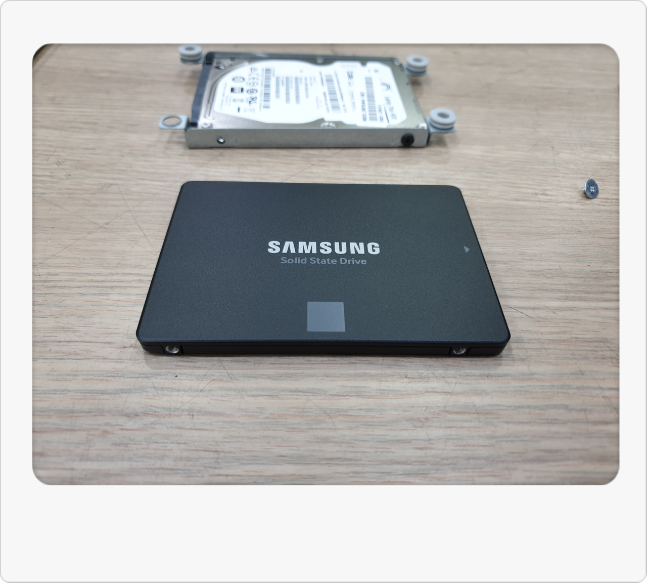 내부를 살펴보니 예상대로 일반 HDD(하드디스크)가 장착된 상태였어요. 이 시기 출시된 올인원PC는 HDD 탑재 비율이 높아서, 시간이 지날수록 점점 속도가 느려지는 문제가 흔합니다. 저 역시 이런 사례를 많이 봐왔기 때문에, 가장 즉각적인 해결책으로 SSD 교체를 권해드렸습니다. 특히 올인원PC는 부품 교체 폭이 제한적이라, HDD → SSD 교체만으로도 눈에 띄는 속도 향상을 기대할 수 있거든요.