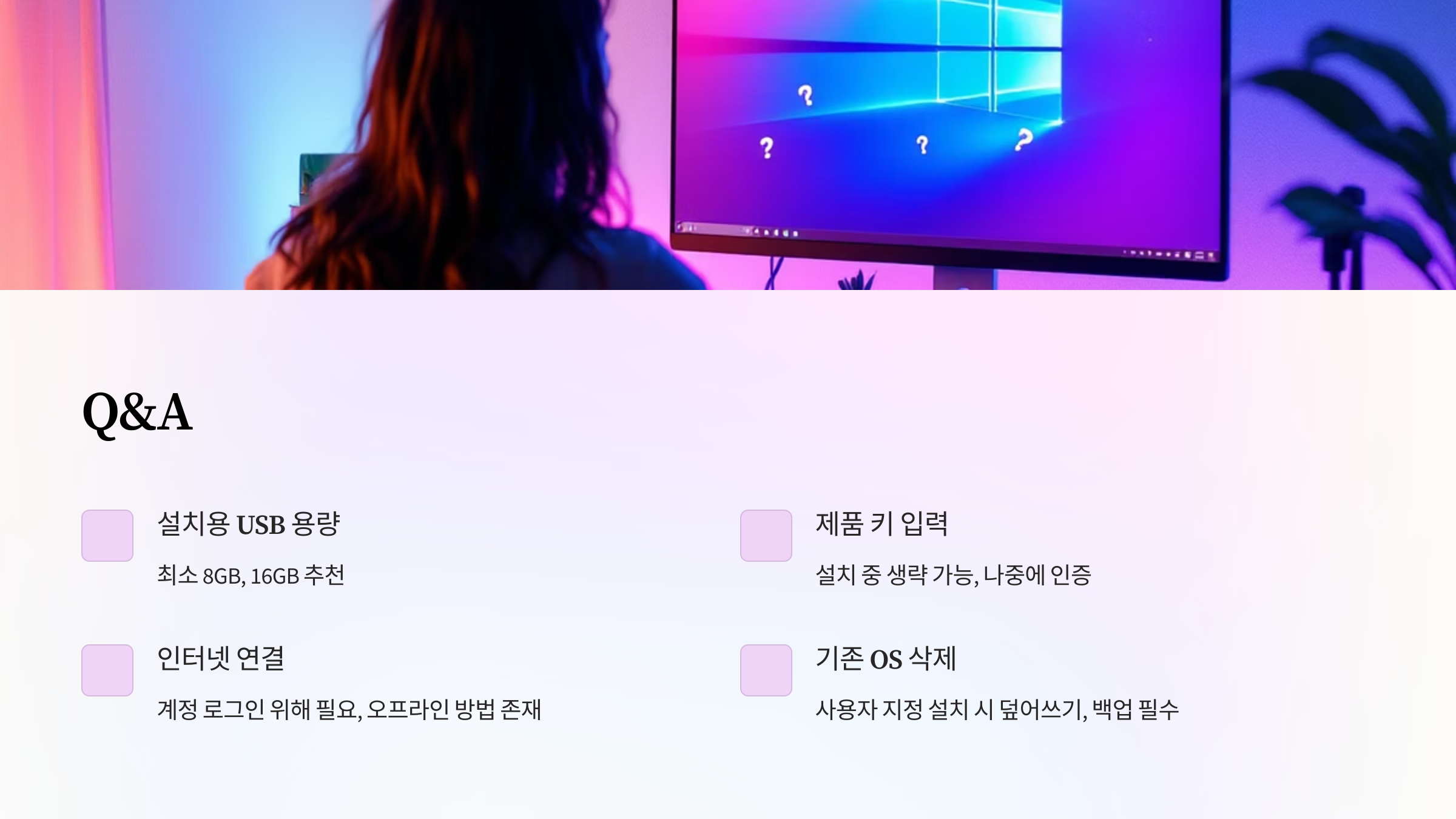 A4: 사용자 지정 설치를 진행하면 기존 운영체제를 덮어쓸 수 있으므로, 중요한 데이터는 반드시 백업하세요.