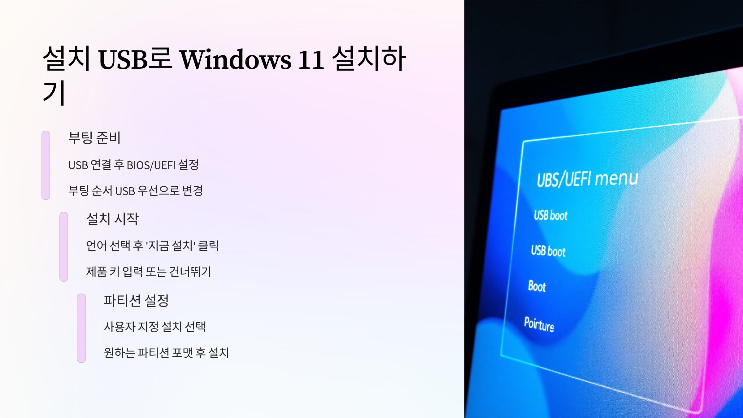 부팅 가능한 USB를 만들었다면, 이제 Windows 11 설치를 진행할 차례입니다. 다음 순서를 따르세요: