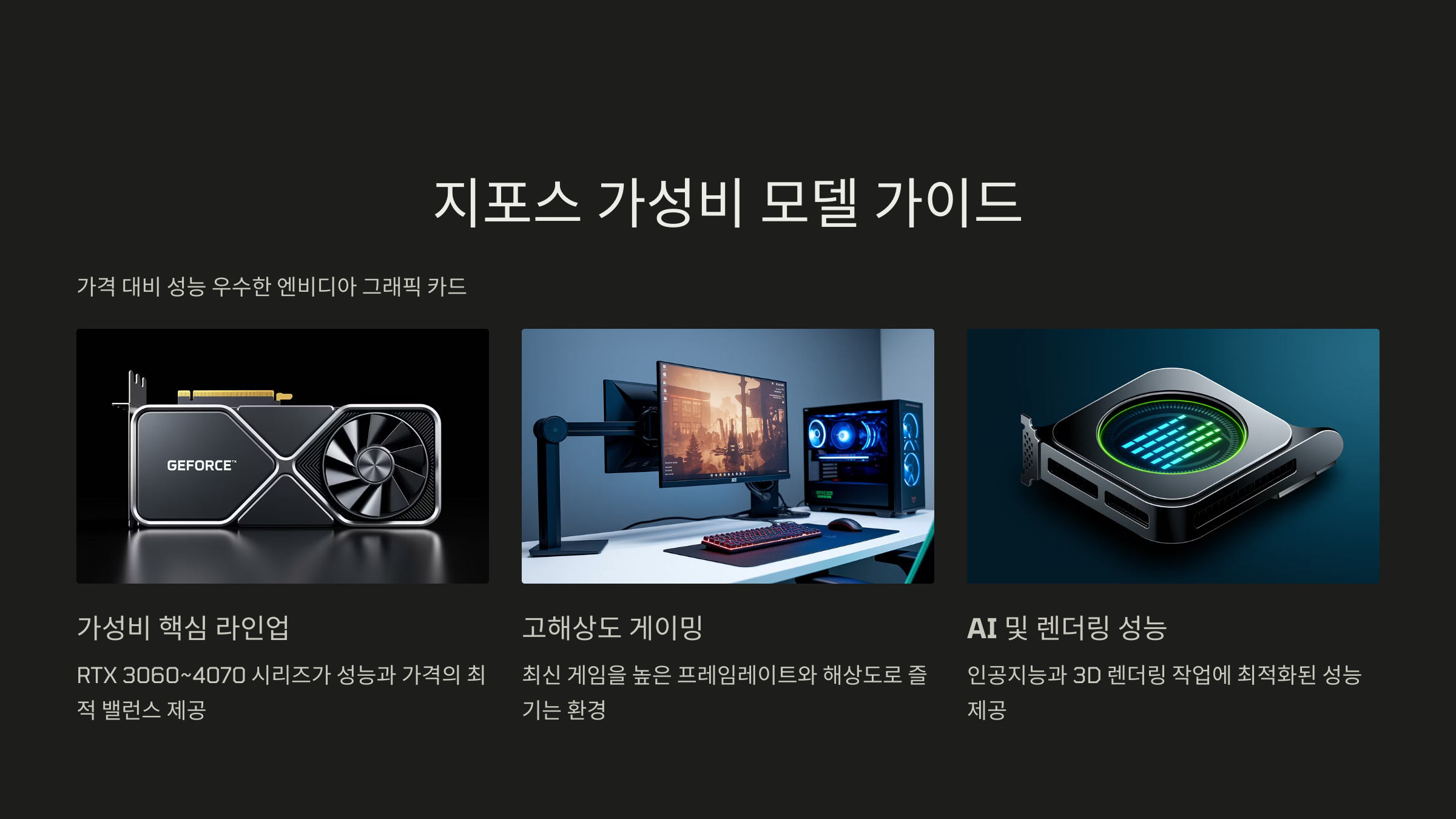 지포스 가성비 모델이란 가격 대비 성능이 우수한 엔비디아(NVIDIA) 지포스 그래픽 카드를 의미합니다. 2024년 들어 인공지능(AI), 고해상도 게이밍, 3D 렌더링 등 그래픽 처리 수요가 증가함에 따라, 소비자들은 더 합리적인 가격에 좋은 성능을 제공하는 제품을 선호하고 있습니다. 특히 GPU 수급이 안정되면서 가격이 하향 안정세를 보이자, 가성비 모델에 대한 관심도 더욱 높아지고 있습니다.