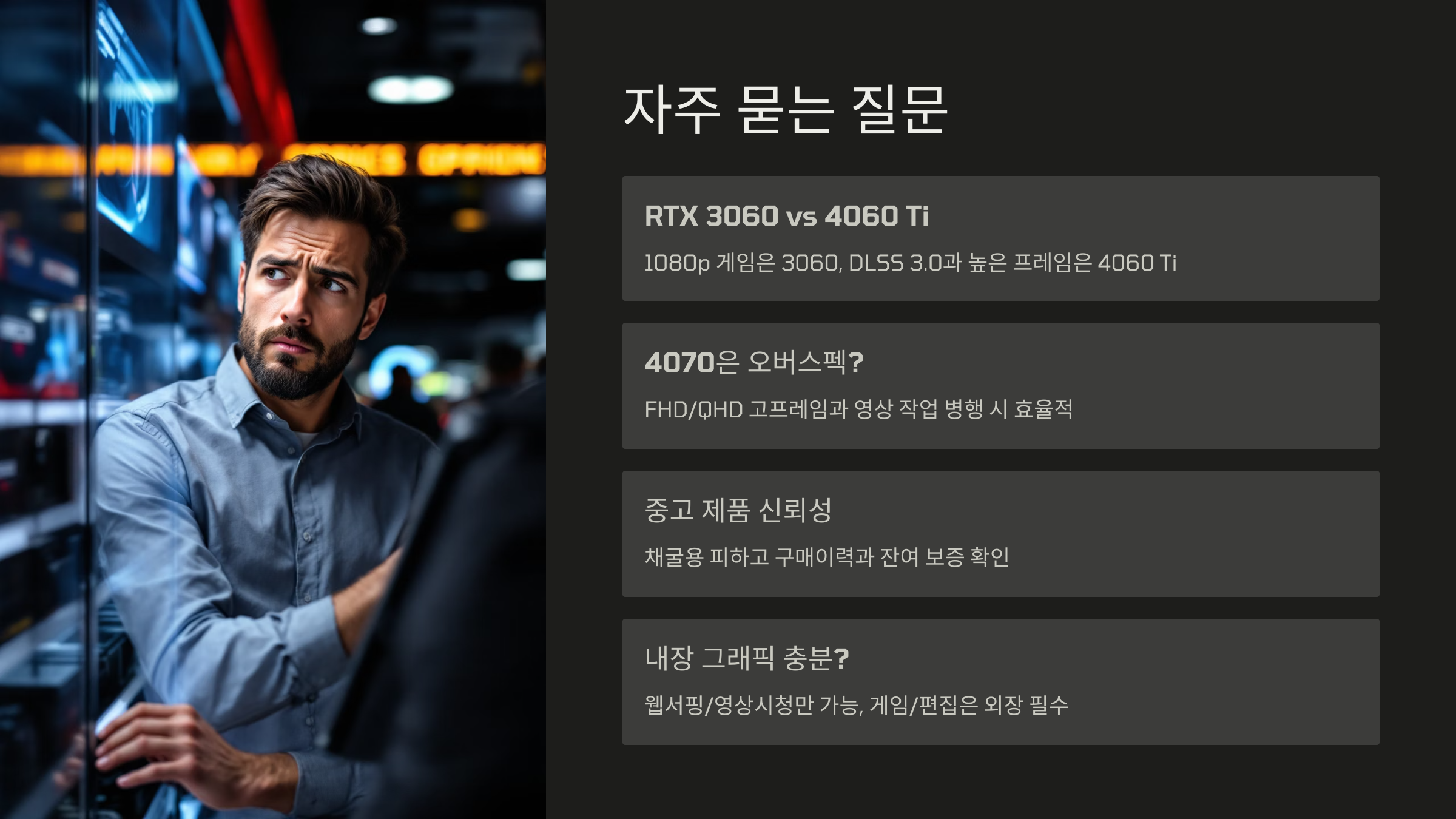 A1: 1080p 게임 위주라면 RTX 3060이 충분하며, DLSS 3.0과 더 높은 프레임을 원한다면 4060 Ti가 더 적합합니다.