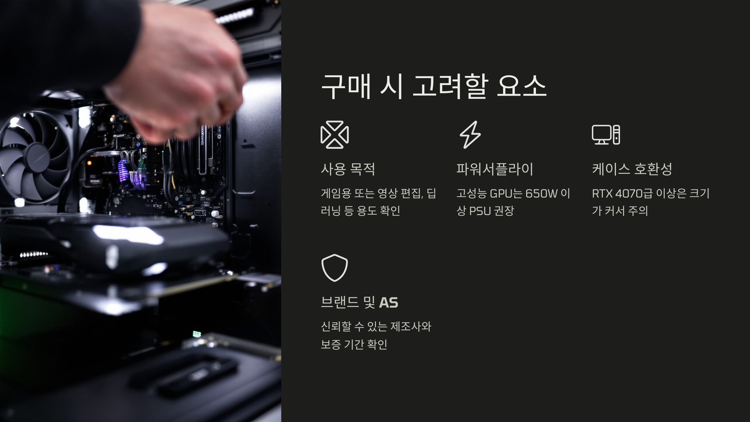 3. 케이스 호환성: RTX 4070급 이상은 크기가 커서 미들타워 케이스에 장착이 어려울 수 있습니다.