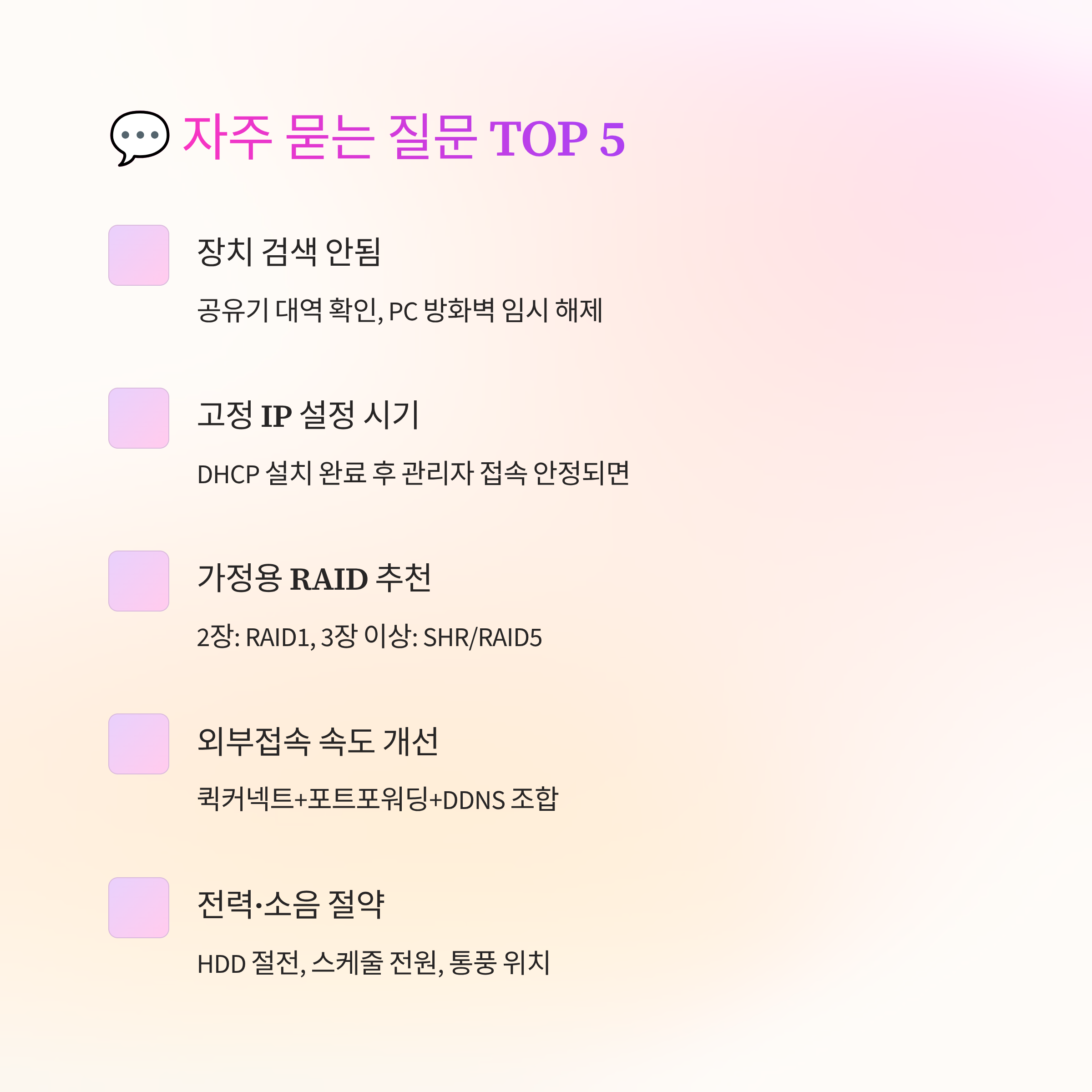 디스크는 가능하면 동일 용량·동일 라인으로 맞추고, CMR 표기 모델을 우선으로 보세요. 발열과 소음을 낮추려면 5400RPM 계열이 집에서는 체감이 좋아요. 베이를 여유 있게 쓰고, 남는 슬롯은 먼지 캡으로 막아두면 관리가 깔끔해요. 나사 고정 시 과하게 조이지 말고, 전면 팬 속도는 ‘저소음’ 프로파일로 시작해도 충분해요. 전원 인가 후 SMART 테스트를 빠르게 돌려 초기 불량을 잡아내면 나중에 자료 옮길 때 마음이 편해요.