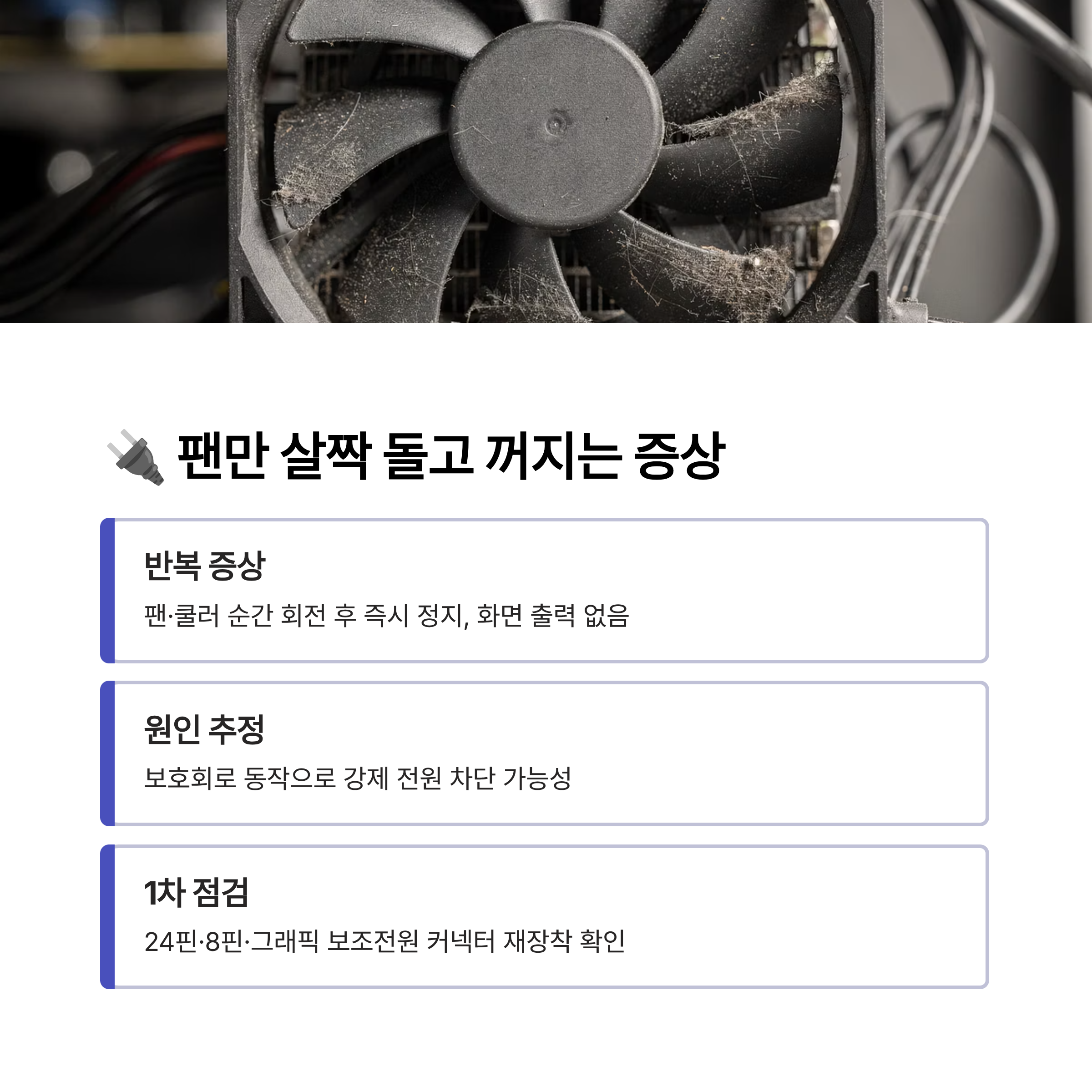 | 주요 증상 | 전원 버튼 누르면 팬만 잠깐 돌고 바로 꺼짐, 화면 출력 없음 |