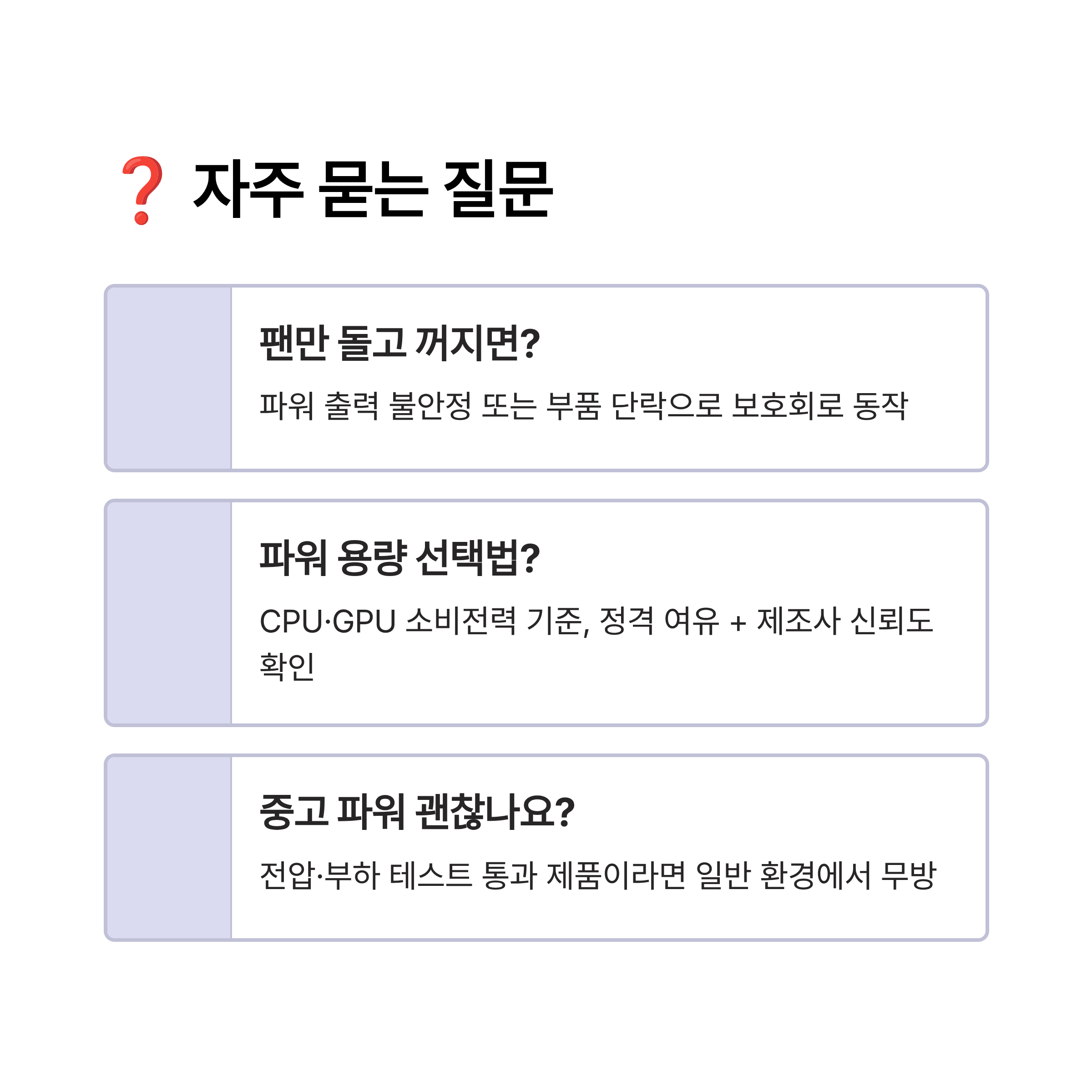 | 전원 버튼을 눌렀을 때 팬만 잠깐 돌고 꺼지면 어떤 문제일 수 있나요? | 파워 출력 불안정으로 보호회로가 동작하는 경우가 많고, 메인보드나 다른 부품 단락으로 인해 전원이 차단될 수도 있습니다. |
