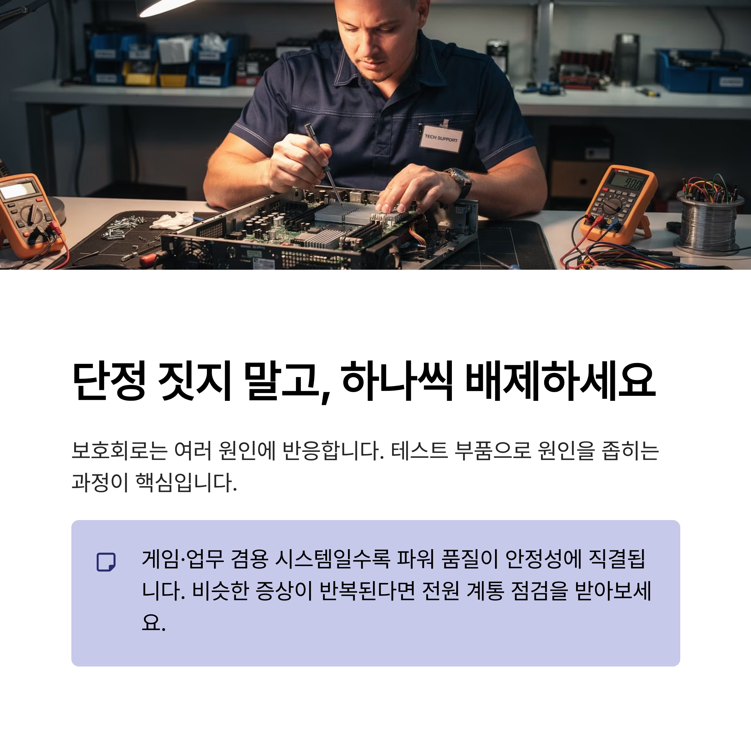 | 활용 상황 | 전원이 들어왔다가 바로 꺼지거나, 팬만 잠깐 돌고 시스템이 올라오지 않는 게임용 PC 진단 기준 |