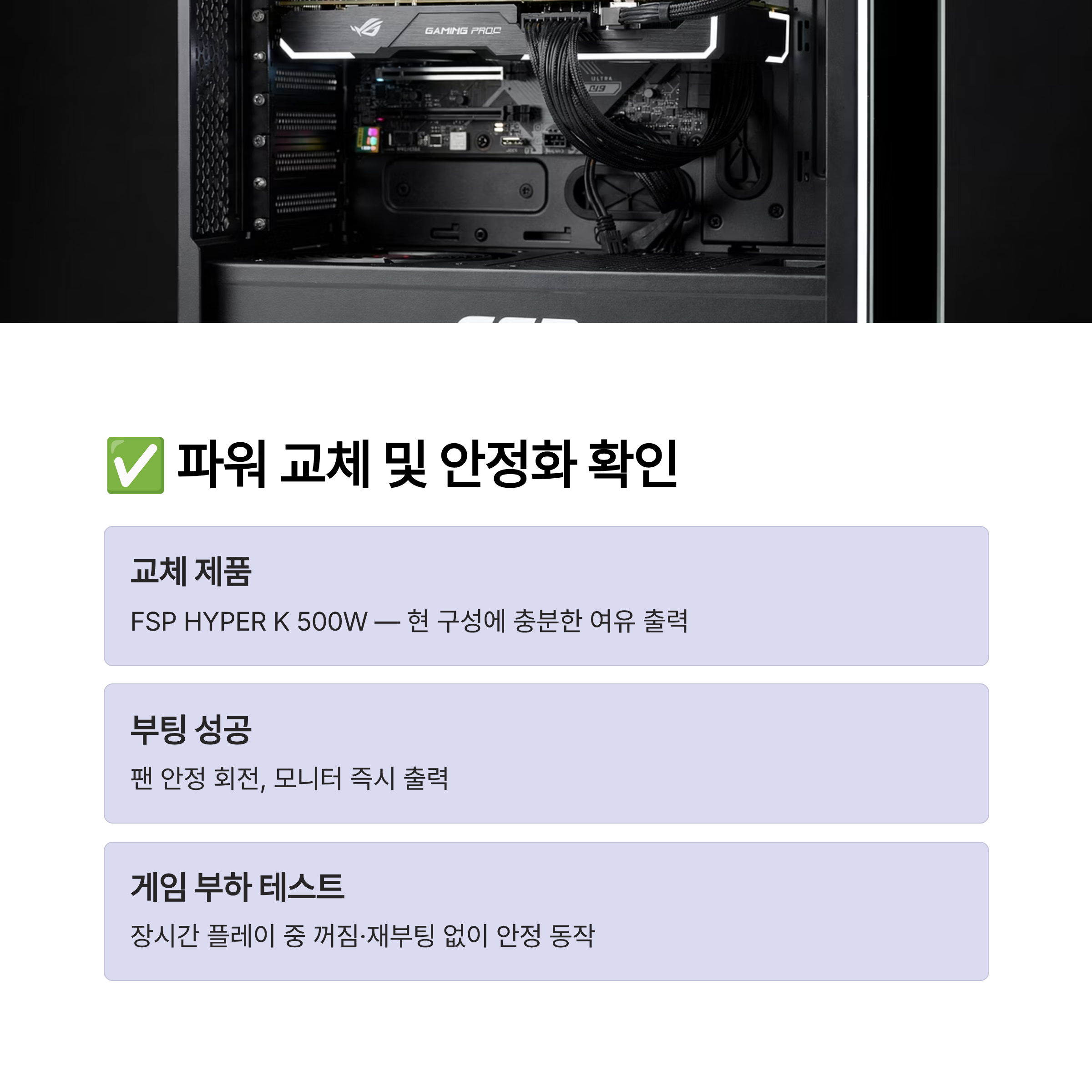 ✅ 파워 교체와 게임 실행 테스트로 안정화 확인