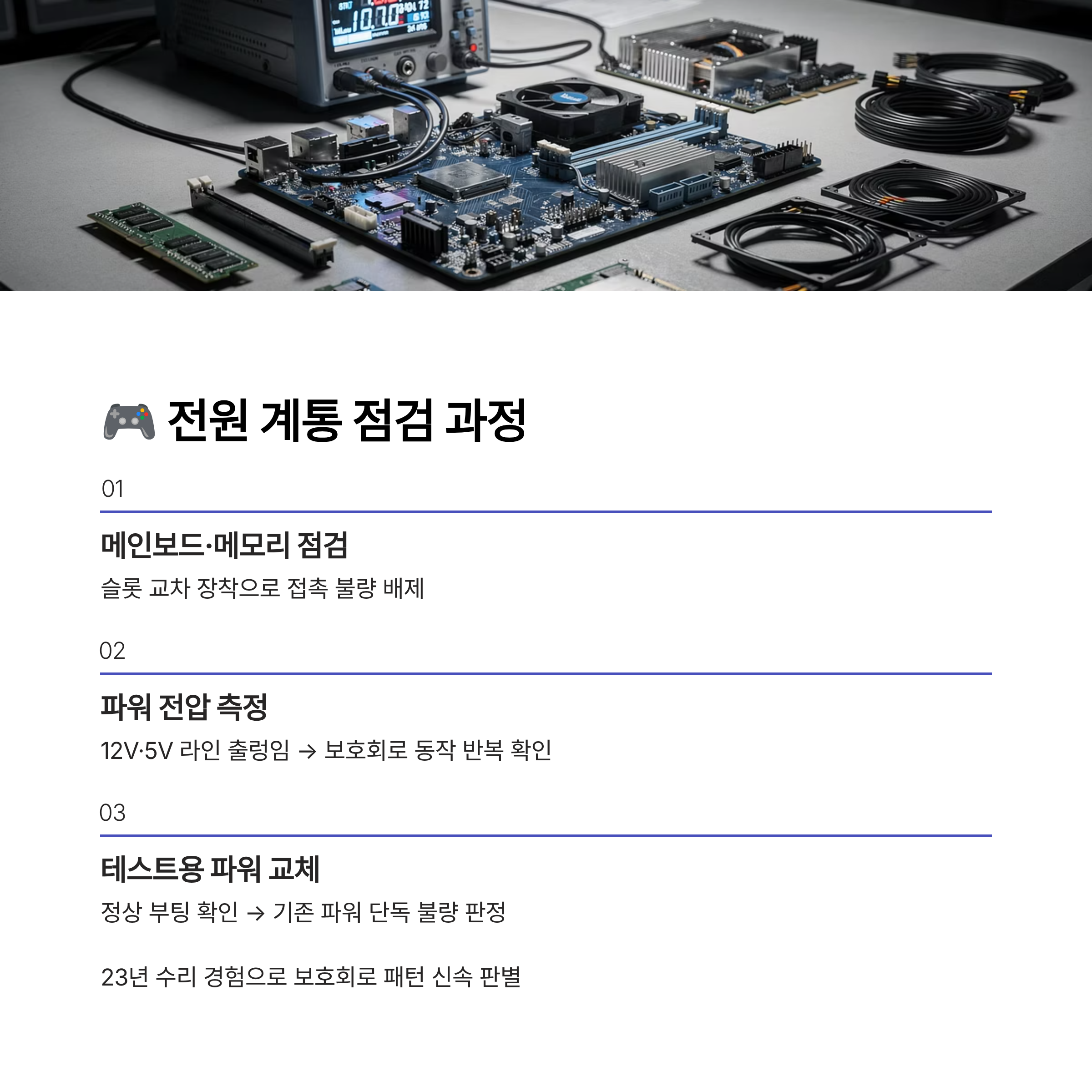 | 점검 내용 | 메인보드 소켓 및 메모리 슬롯 확인, 테스트용 메모리 교차 장착, 파워 전압 출력 및 보호회로 동작 패턴 점검 |