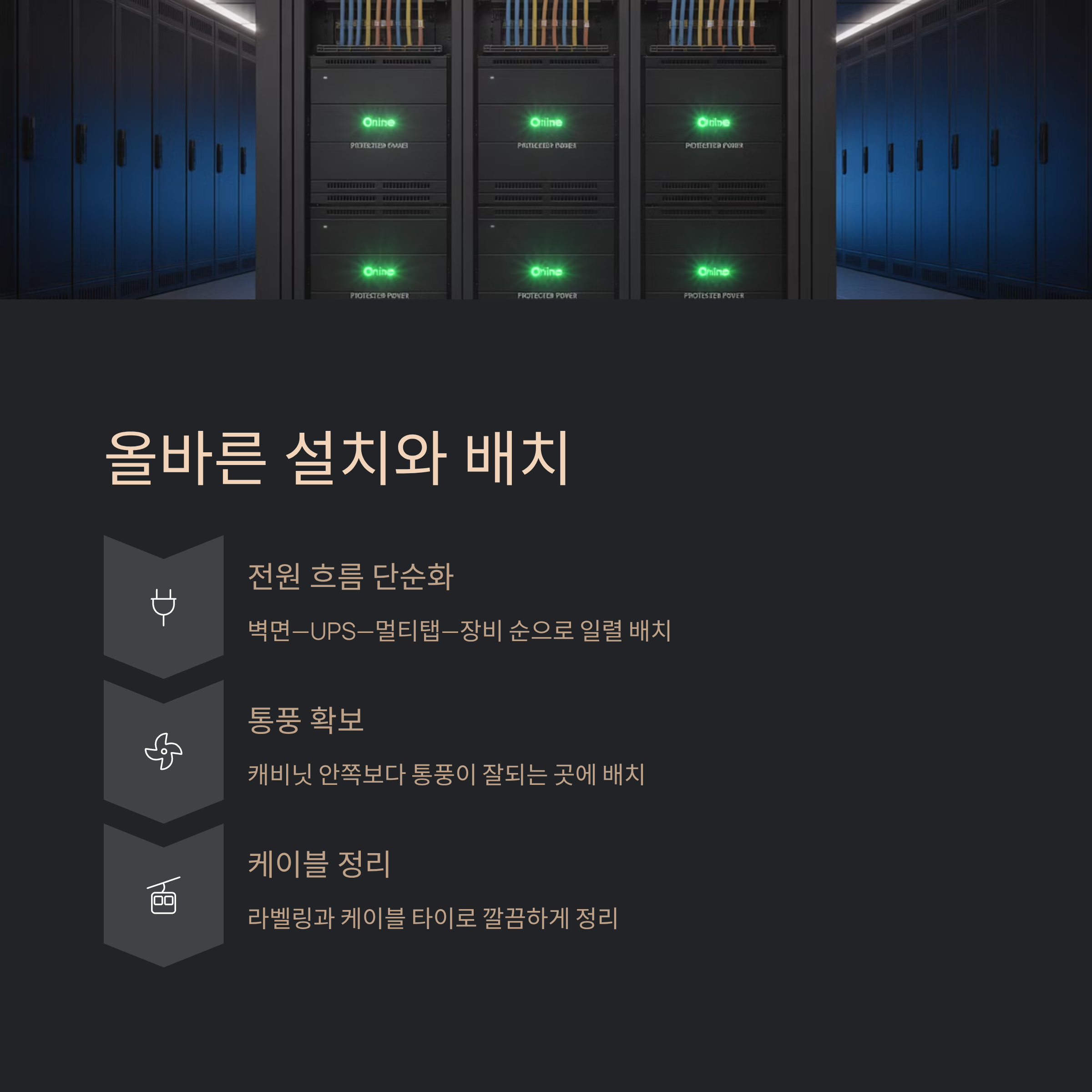 설치할 때는 전원 흐름을 단순하게 만드는 게 최고예요. 벽면—UPS—멀티탭—장비 순으로 일렬로 두고, 프린터나 청소기처럼 순간 전류가 큰 가전은 다른 벽면 콘센트로 분리해 주세요. 배터리 출력구와 서지 보호 전용구가 따로 있는 모델이라면, 필수 장비만 배터리 출력에 꽂고 나머지는 서지 보호 쪽으로 돌리면 효율이 좋아요. 전원 케이블 길이를 억지로 늘리지 말고, 가능한 한 짧게 유지하는 게 안정적이에요.