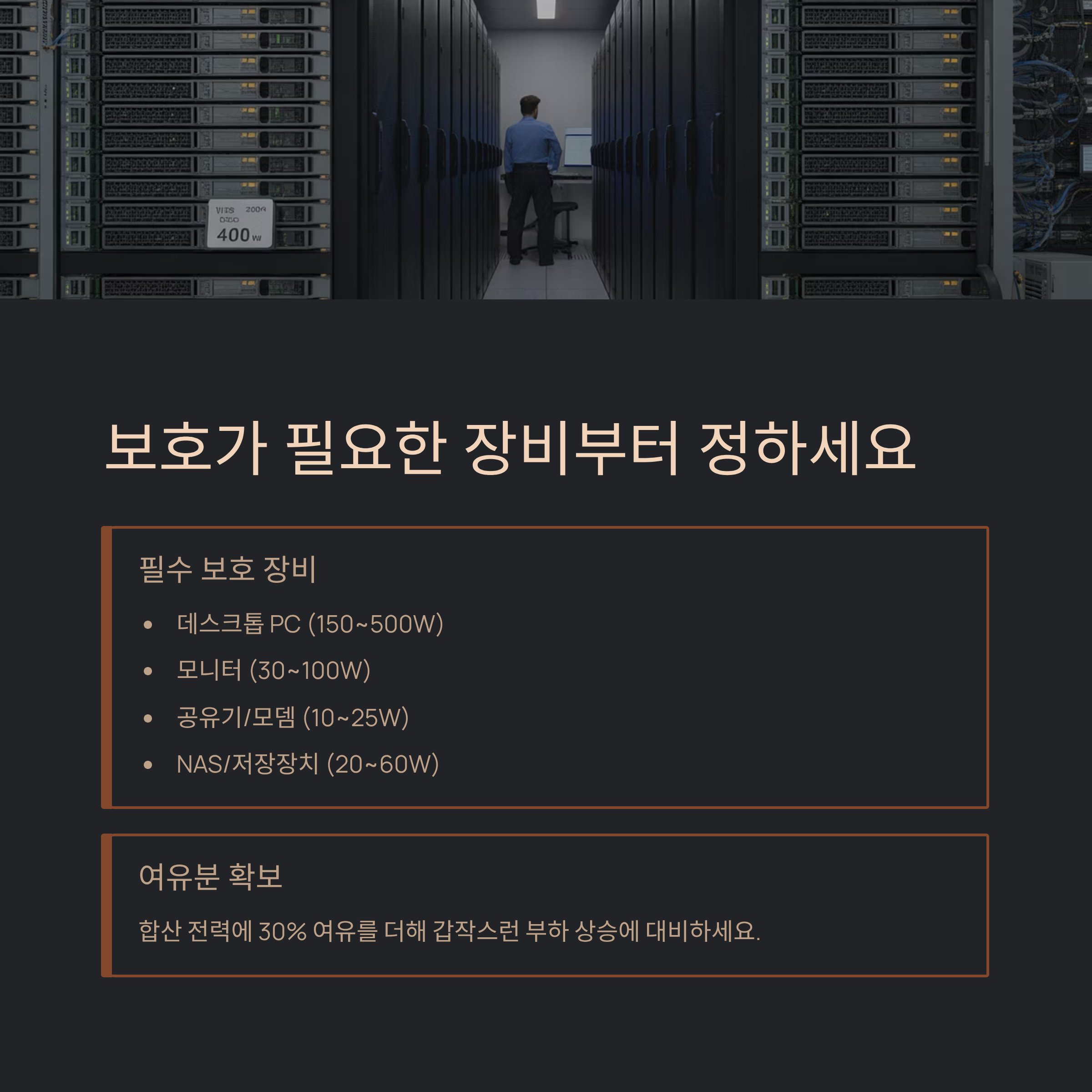 A. 장비 합산 W에 여유 30%를 더하고, 필요한 백업 시간을 정하세요. 그다음 정격 W와 배터리 타입을 보고 고르시면 돼요.