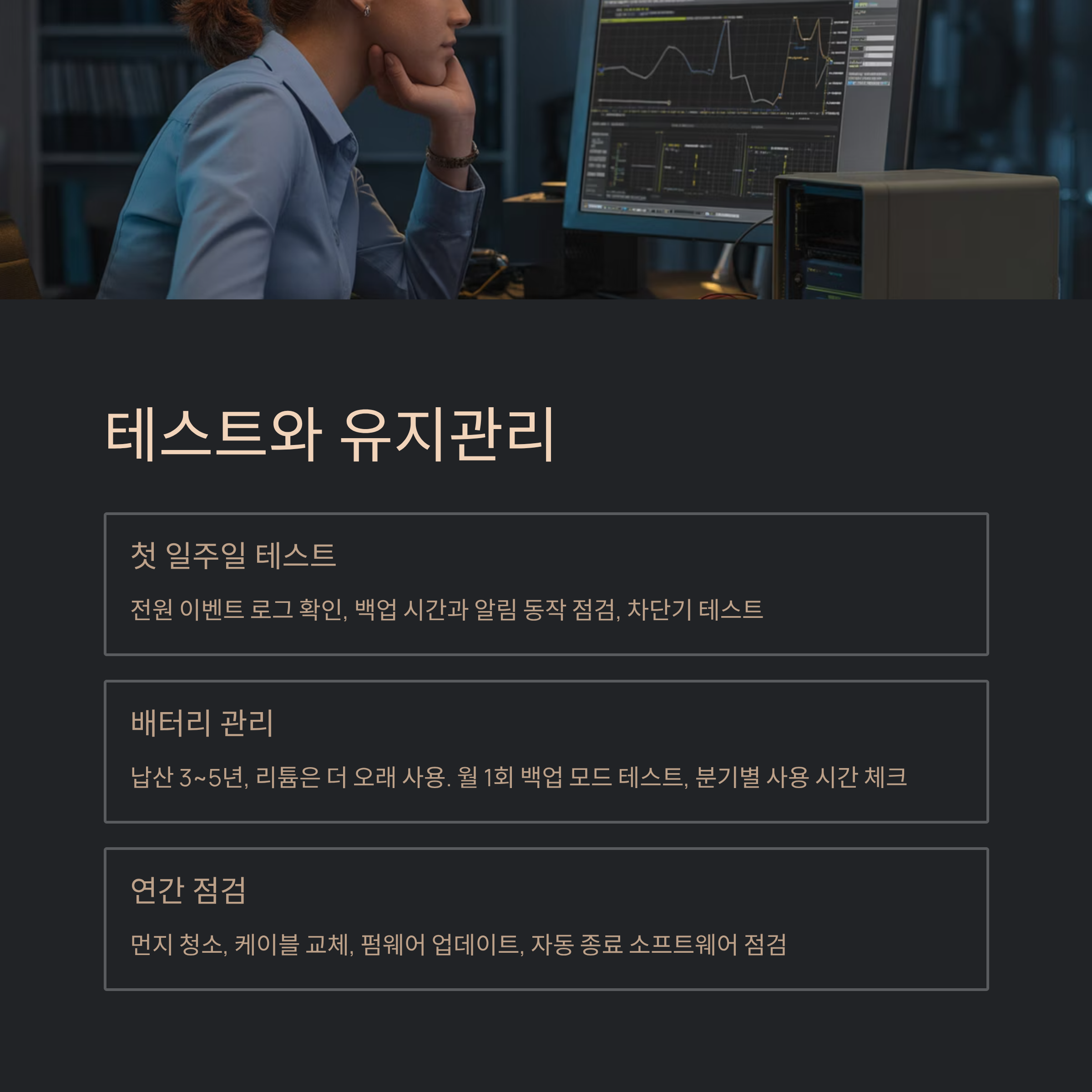 장비를 다 연결했으면 테스트 주간을 가져요. 평소처럼 사용하면서 전원 이벤트가 있었는지 로그를 확인하고, 백업 시간과 알림이 예상대로 동작하는지 점검해요. 일부러 차단기를 내려보는 강제 테스트도 도움이 돼요. 이때 모니터 꺼짐, 오디오 노이즈, 네트워크 끊김 같은 사소한 증상까지 메모해 두면 원인 찾기가 쉬워요. 팬이 불필요하게 자주 도는지도 함께 보세요. 온도와 소음이 괜히 올라가면 위치나 통풍을 조정해야 해요.