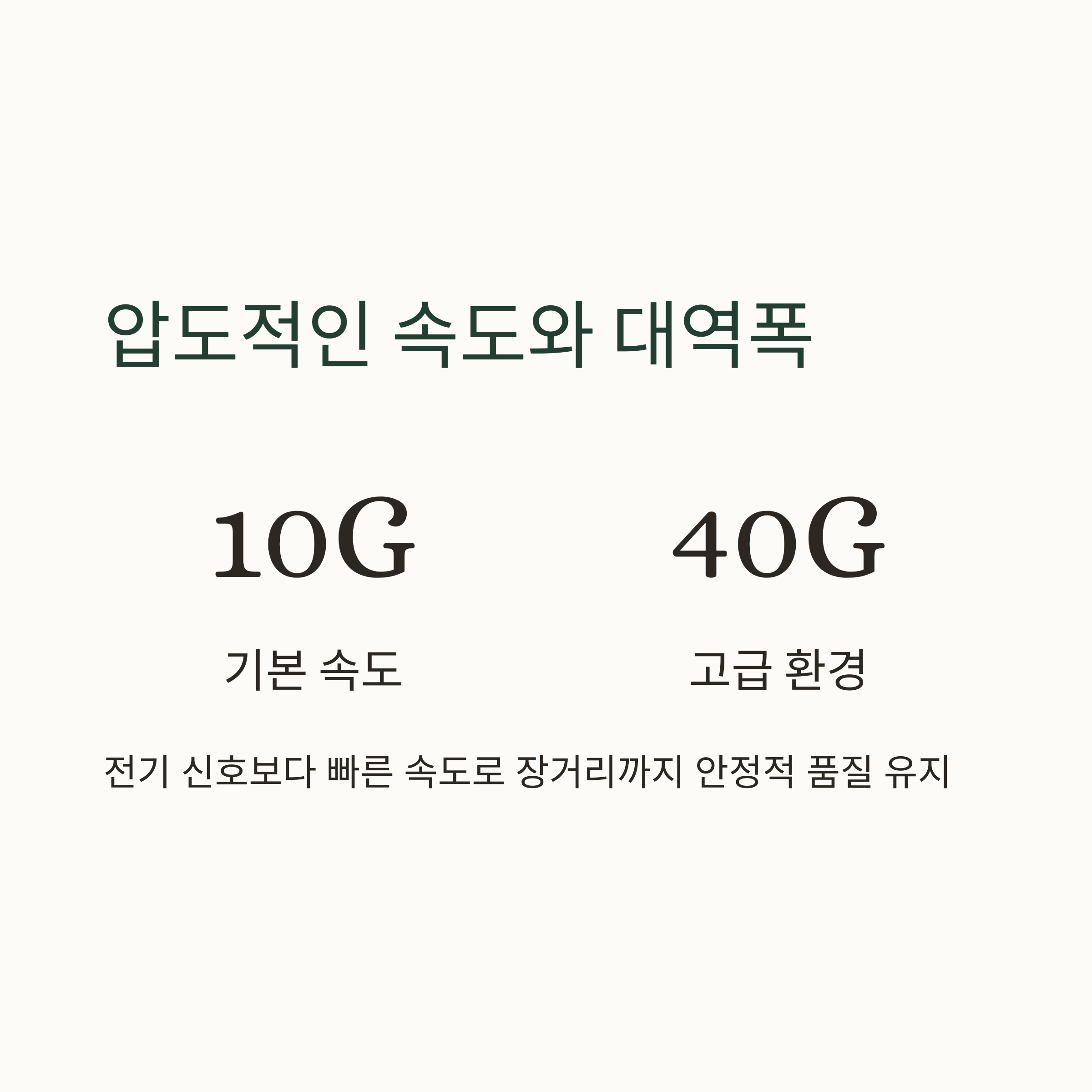 광 방식은 전기 신호보다 훨씬 빠른 속도로 데이터를 전달할 수 있고, 속도 저하 없이 장거리까지 안정적인 품질을 유지할 수 있다는 점이 가장 큰 매력이에요. 사용해보면 확실히 대역폭에 여유가 생긴 게 느껴져요.