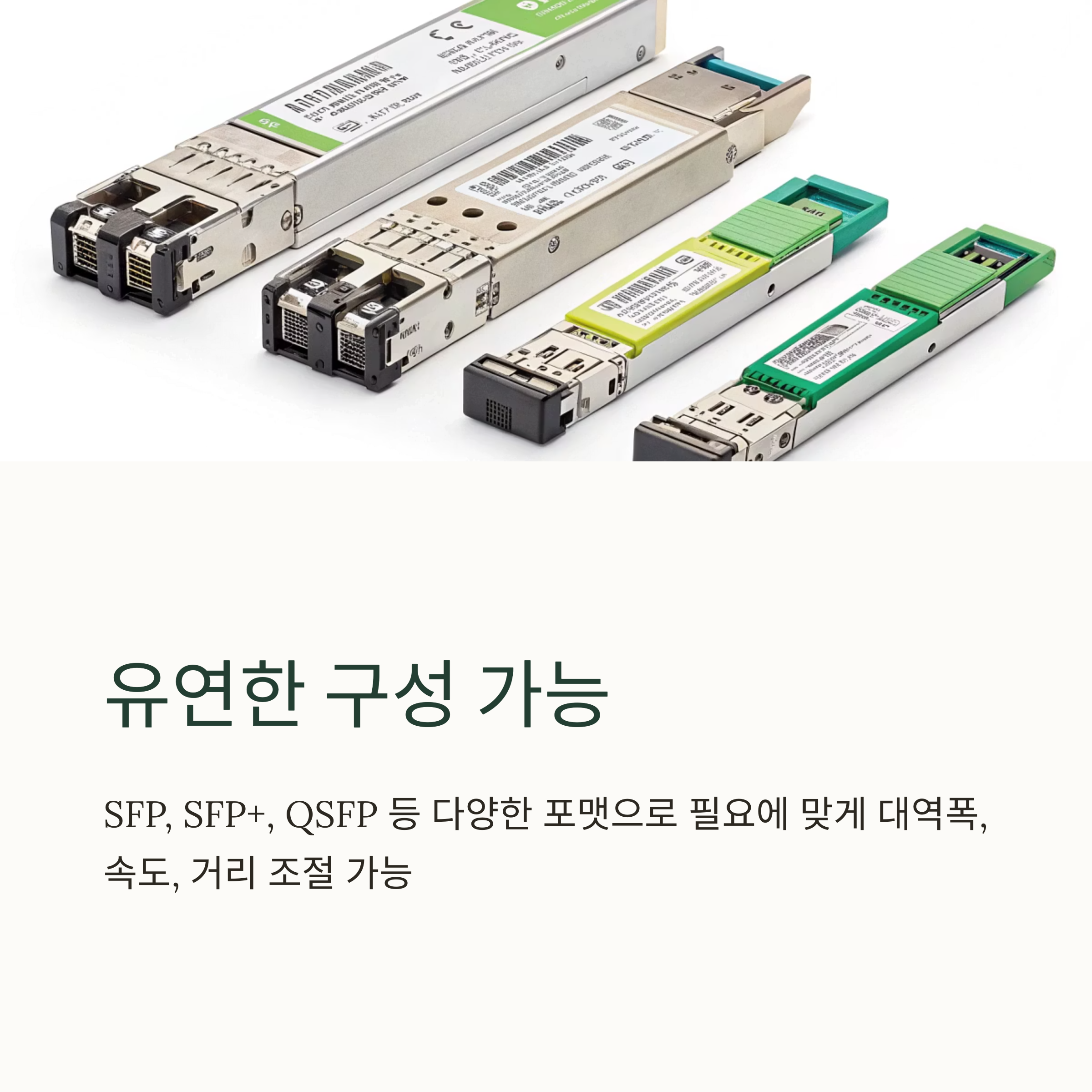 장비나 환경에 따라 요구되는 사양이 다른데, 광 방식은 이런 부분에 유연하게 대응할 수 있는 게 장점이에요. SFP, SFP+, QSFP 등 다양한 포맷이 있어서, 필요에 따라 대역폭과 속도, 거리 등을 조절할 수 있어요.