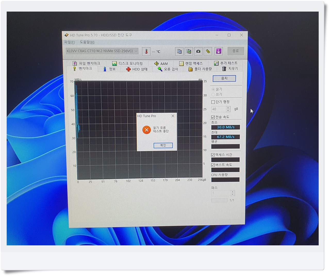 최근에는 구형 HDD 대신 SSD가 대중적으로 활용되고 있는데, SSD 역시 사용 기간이나 관리 상태에 따라 고장이 발생할 수 있습니다. 특히 NVMe 규격 SSD의 경우 속도는 빠르지만, 한 번 문제가 생기면 데이터를 전혀 읽어들이지 못하는 심각한 오류가 발생하기도 합니다. 그래서 저는 한성컴퓨터에 장착된 SSD를 제거하고 다른 장비에 연결해 오류 여부를 확인해보았습니다. 검사 결과, SSD에서 읽기 및 쓰기가 제대로 이루어지지 않는 치명적인 에러가 검출되었습니다. 이런 상황은 금천동컴퓨터수리(2) 작업을 해본 분들이라면 익히 경험했을 만한 사례입니다. 해당 SSD는 이미 데이터를 복원하기 어려울 정도로 손상된 상태였고, 결국 새 NVMe SSD로 교체하는 것이 최선의 해결책이라는 판단이 섰습니다.