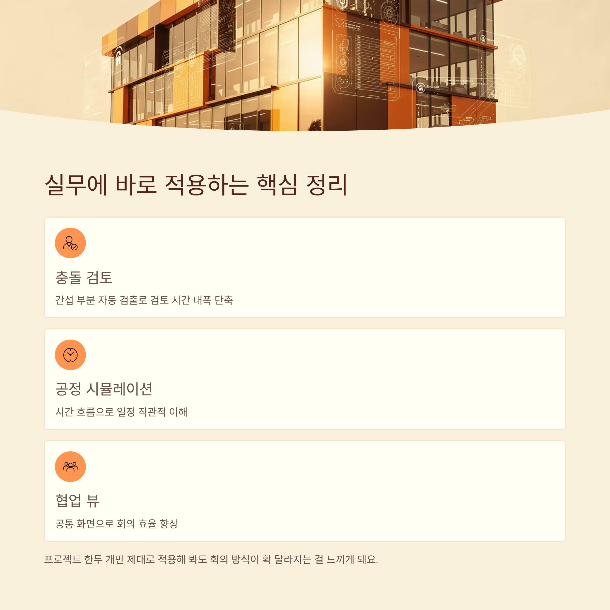 시뮬레이션을 돌려보면서 발견한 이슈는 바로 뷰에 표시를 남겨두거나, 해당 공정 줄에 메모를 추가해 두면 나중에 회의에서 근거 자료로 쓰기 좋아요. 이렇게 그림과 일정이 같이 움직이면, 공정표에 익숙하지 않은 사람도 진행 상황을 훨씬 쉽게 이해해요.