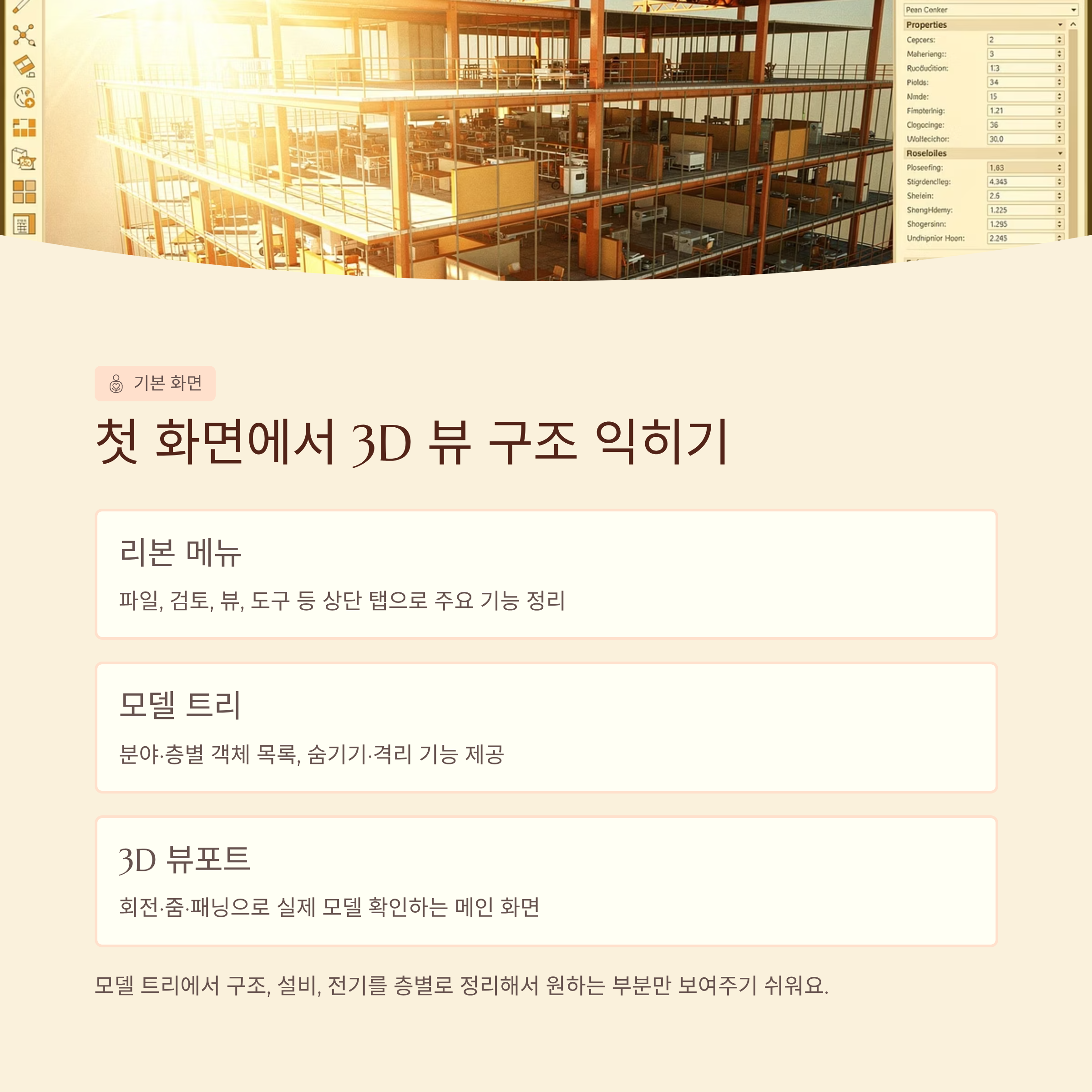 모델 트리에서는 구조, 설비, 전기 같은 분류가 층별로 정리돼 있어서, 원하는 부분만 숨기거나 보여주기가 쉬워요. 처음에는 전체를 켜둔 상태에서 하나씩 꺼보면서 화면이 어떻게 변하는지만 체크해 보셔도 좋아요. 이렇게 몇 번만 반복하면 어느 층에 어떤 시스템이 있는지 감이 훨씬 빨리 잡혀요.
