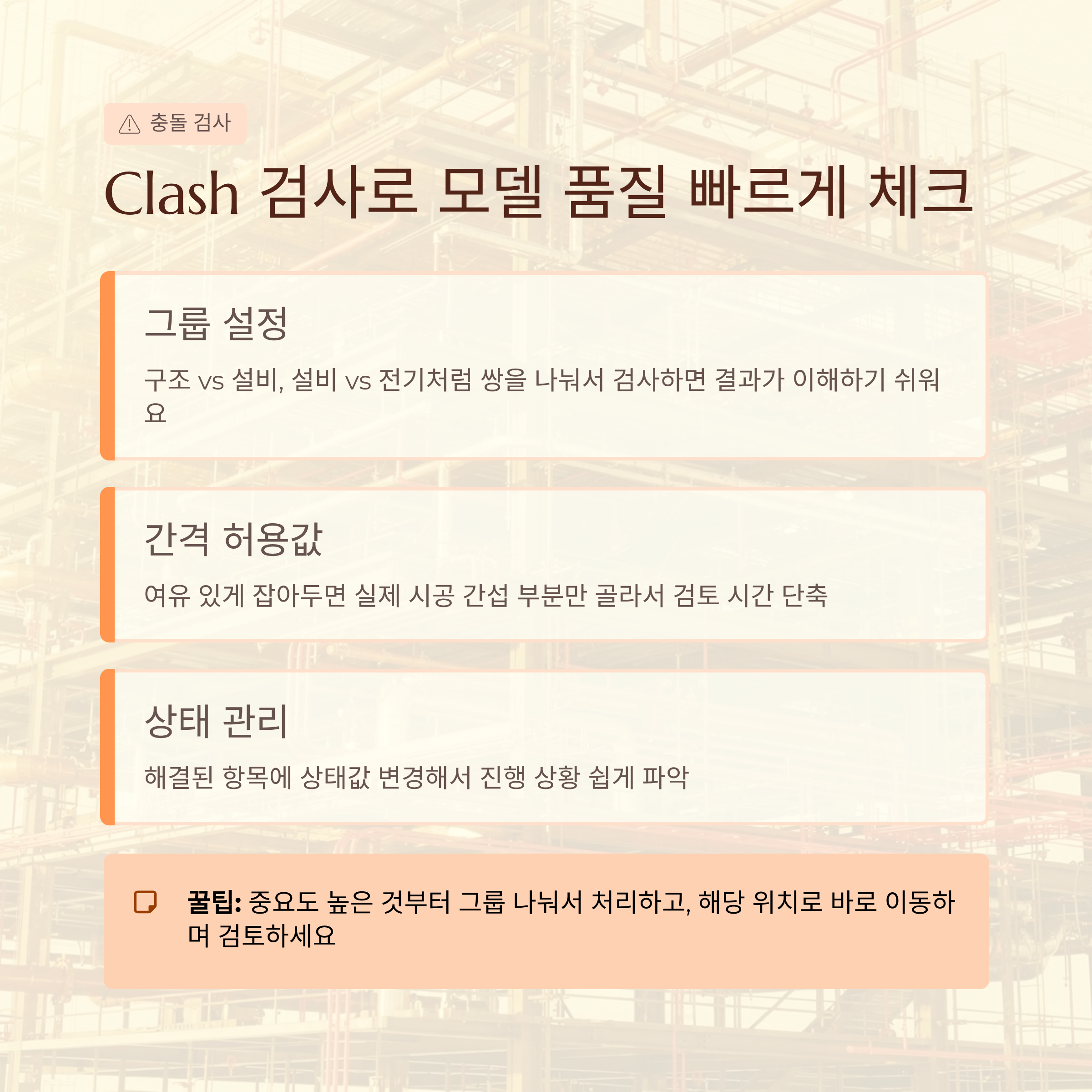 | Q. 작은 간섭까지 전부 잡아야 할까요? | A. 시공에 직접적인 영향을 주는 부분과 단순 간섭을 나눠서 보고, 필요 이상으로 세밀하게 잡지는 않는 편이 업무에 더 효율적이에요. |