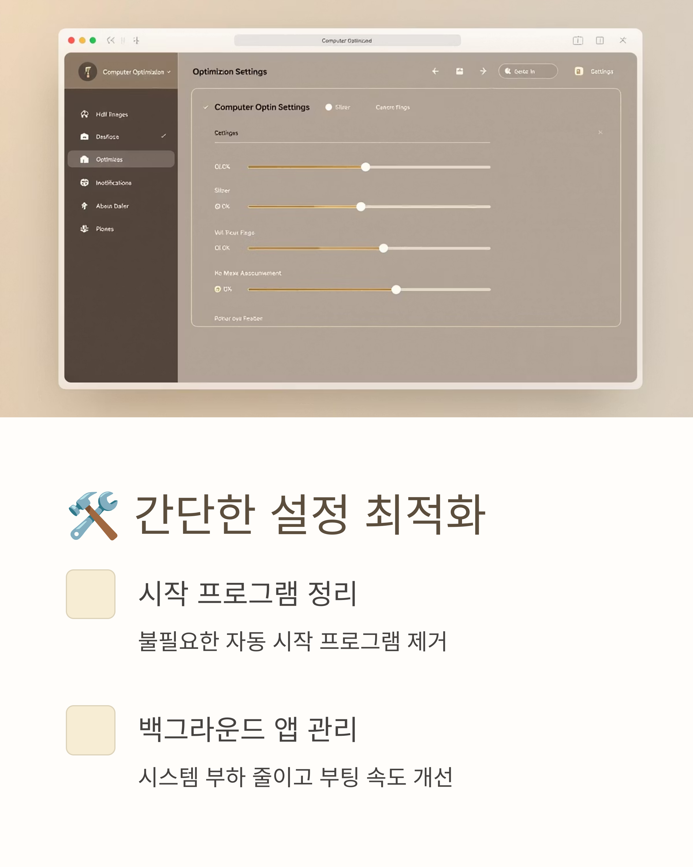 시작 프로그램이 너무 많거나 백그라운드에서 실행 중인 앱이 많을 경우, 부팅 속도나 전체 성능이 느려질 수 있어요. 이럴 땐 설정 최적화 기능을 활용해보시면 좋아요.