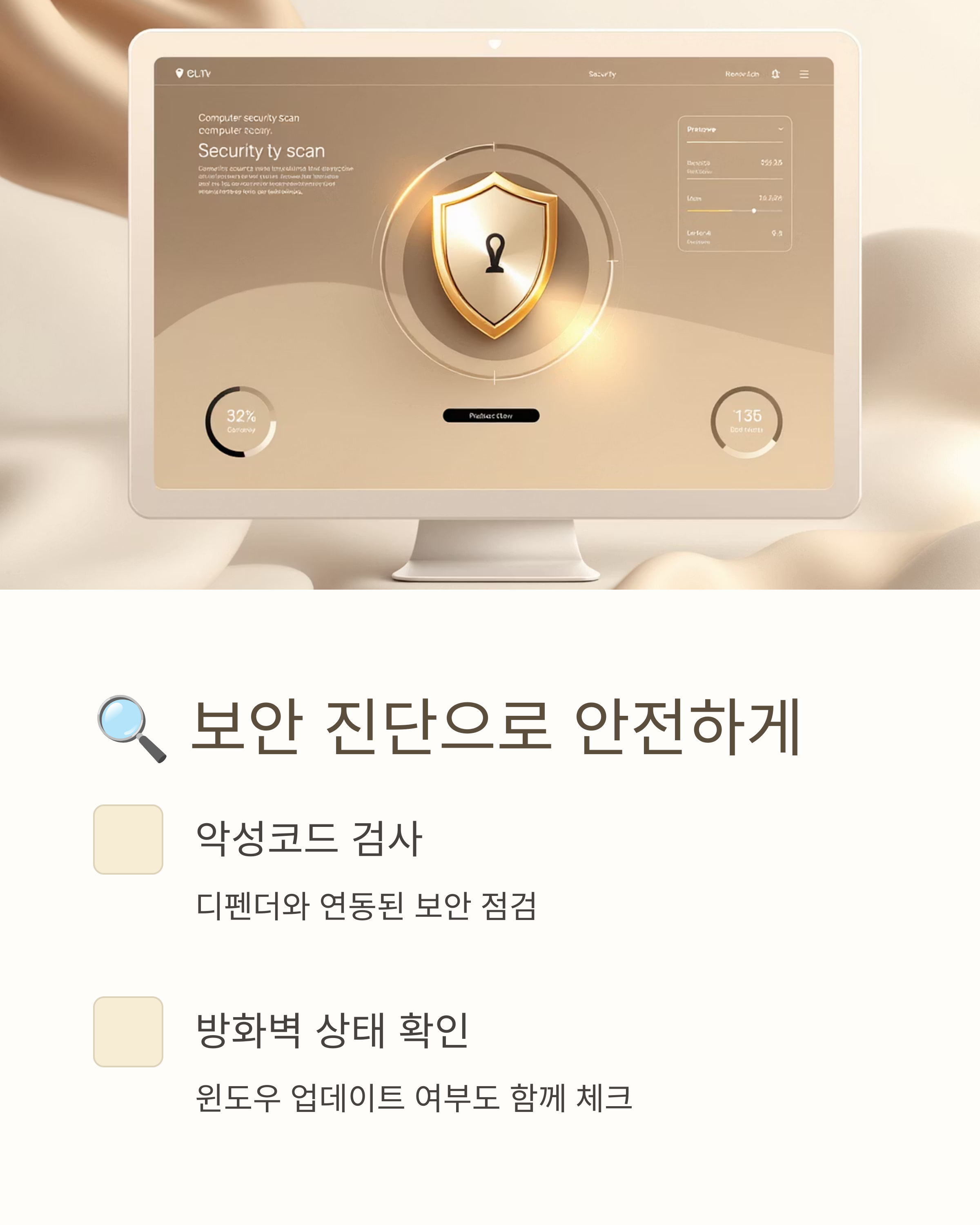 단순히 속도 개선만이 아니라, 악성코드나 보안 위협에 대한 간단한 검사도 가능해요. 기본 백신인 디펜더와 연동해서 보안 상태를 빠르게 확인하실 수 있도록 도와주거든요.