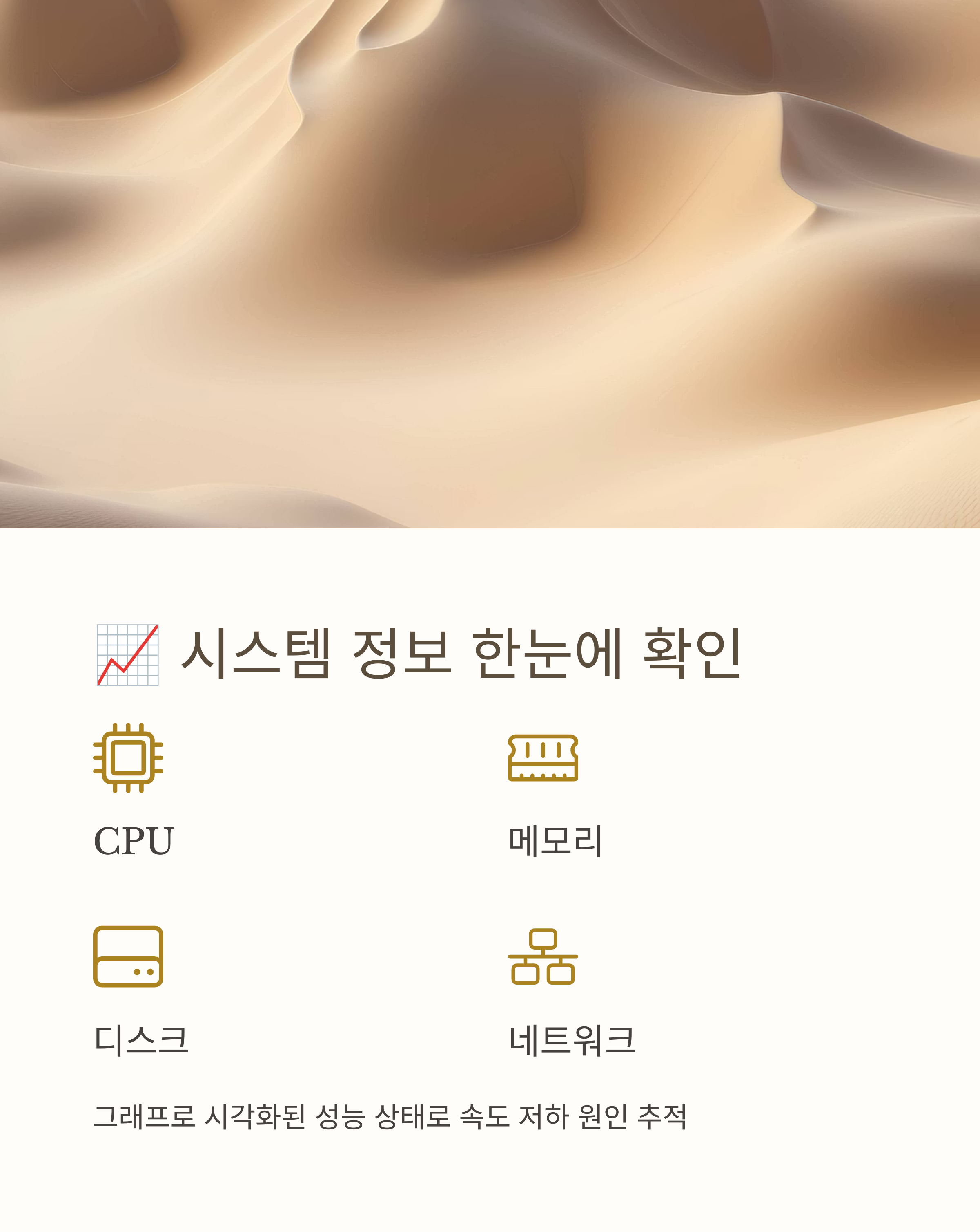 현재 컴퓨터의 사양이나 자원 사용량을 확인하고 싶으셨다면 ‘내 PC 정보’ 항목을 확인해보시는 게 좋아요. CPU, 메모리, 디스크, 네트워크 상태를 그래프로 시각화해주니까 보기에도 편하구요.