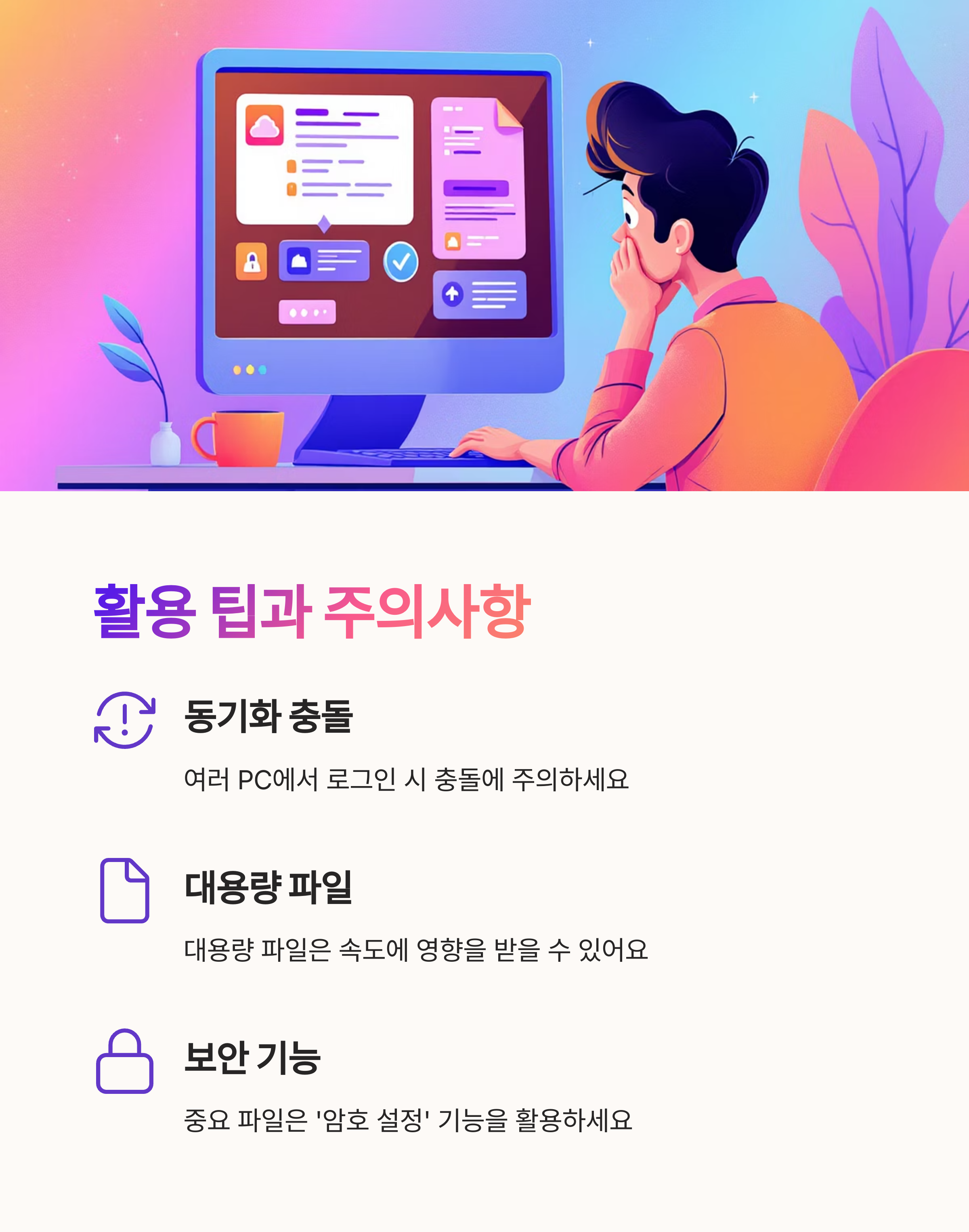 - 여러 대 PC에서 로그인 시 동기화 충돌에 주의