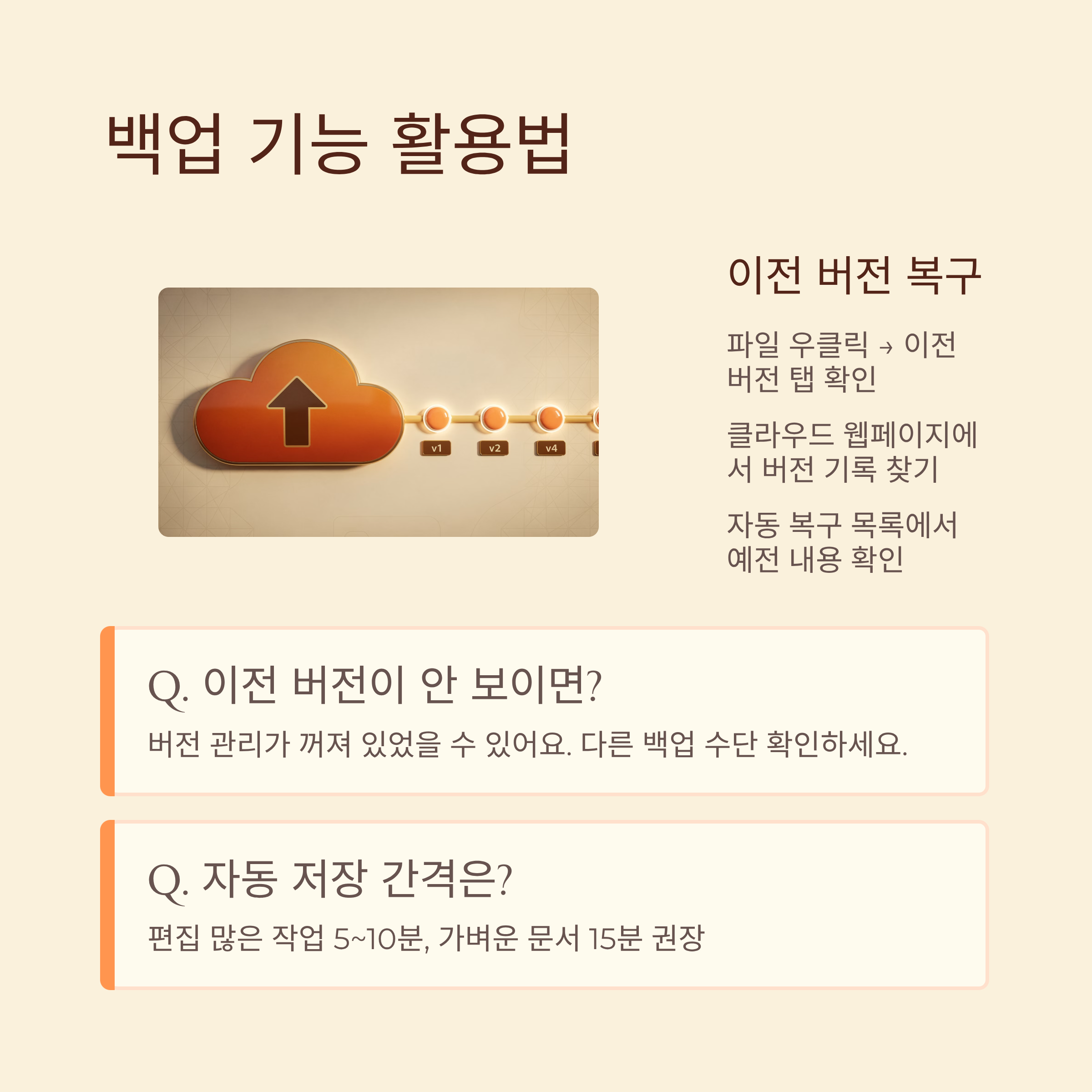 A5. 자동 저장 간격을 줄이고, 문서가 모이는 폴더에 버전 기록 기능을 켜 두는 것만으로도 리스크가 크게 줄어들어요.