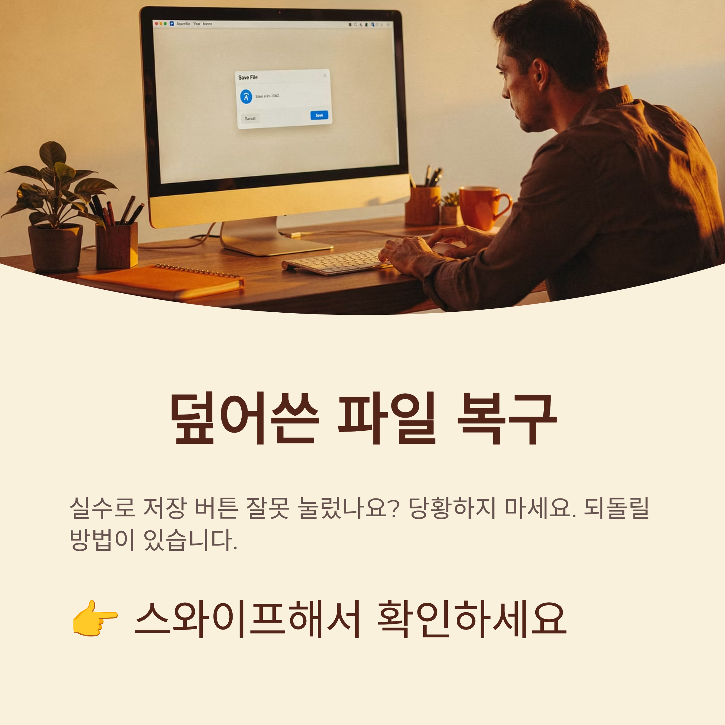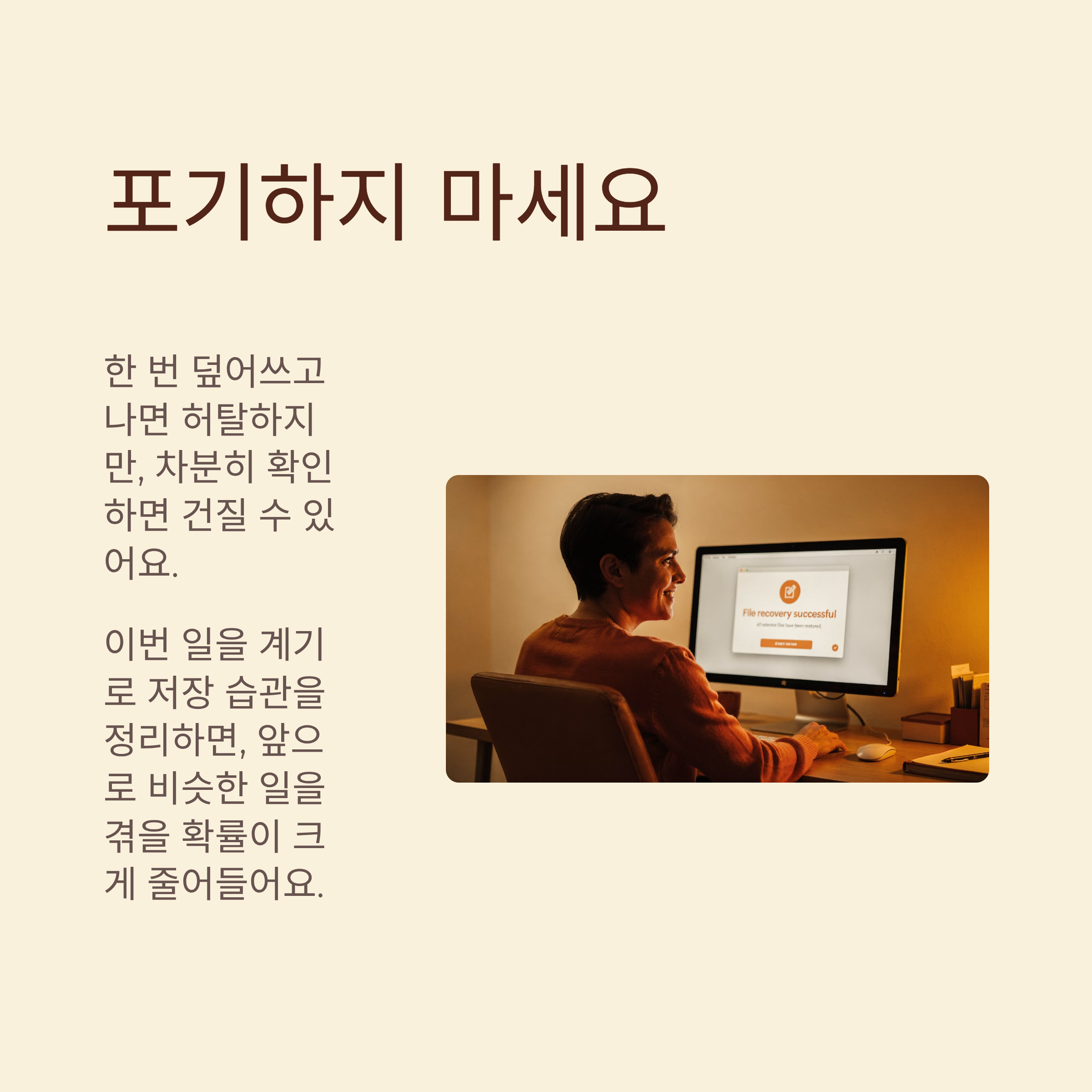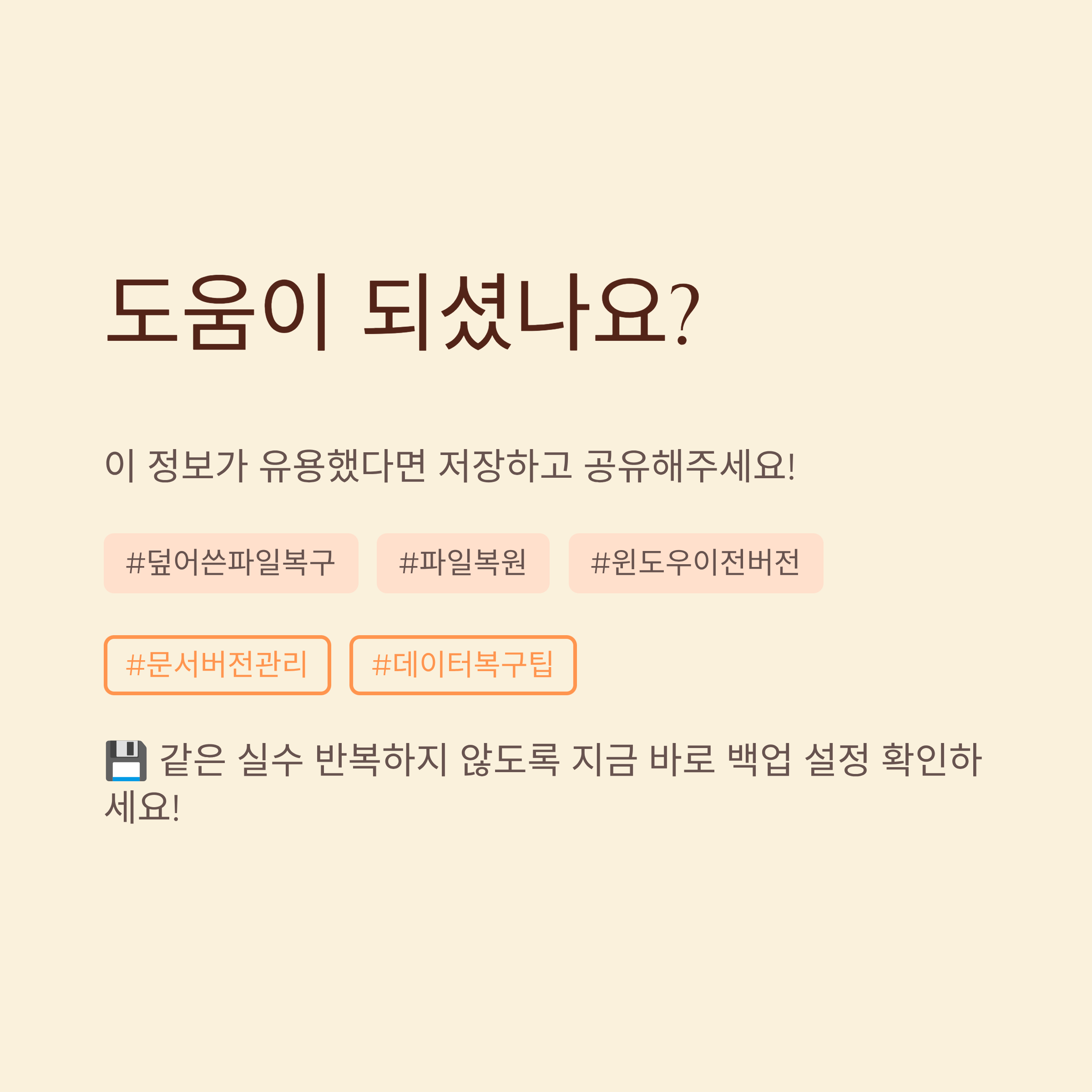 한 번 덮어쓰고 나면 허탈한 마음이 먼저라서, 복구 방법을 찾아보는 것조차 힘들게 느껴질 수 있어요. 그래도 오늘 정리한 순서대로 차분히 확인해 보면, 처음엔 끝난 줄 알았던 상황에서도 생각보다 건질 수 있는 부분이 나올 때가 있어요. 무엇보다 이번 일을 계기로 저장 습관을 한 번 정리해 두면, 앞으로 비슷한 일을 겪을 확률이 크게 줄어든다는 점에서 의미가 꽤 크다고 느껴져요.