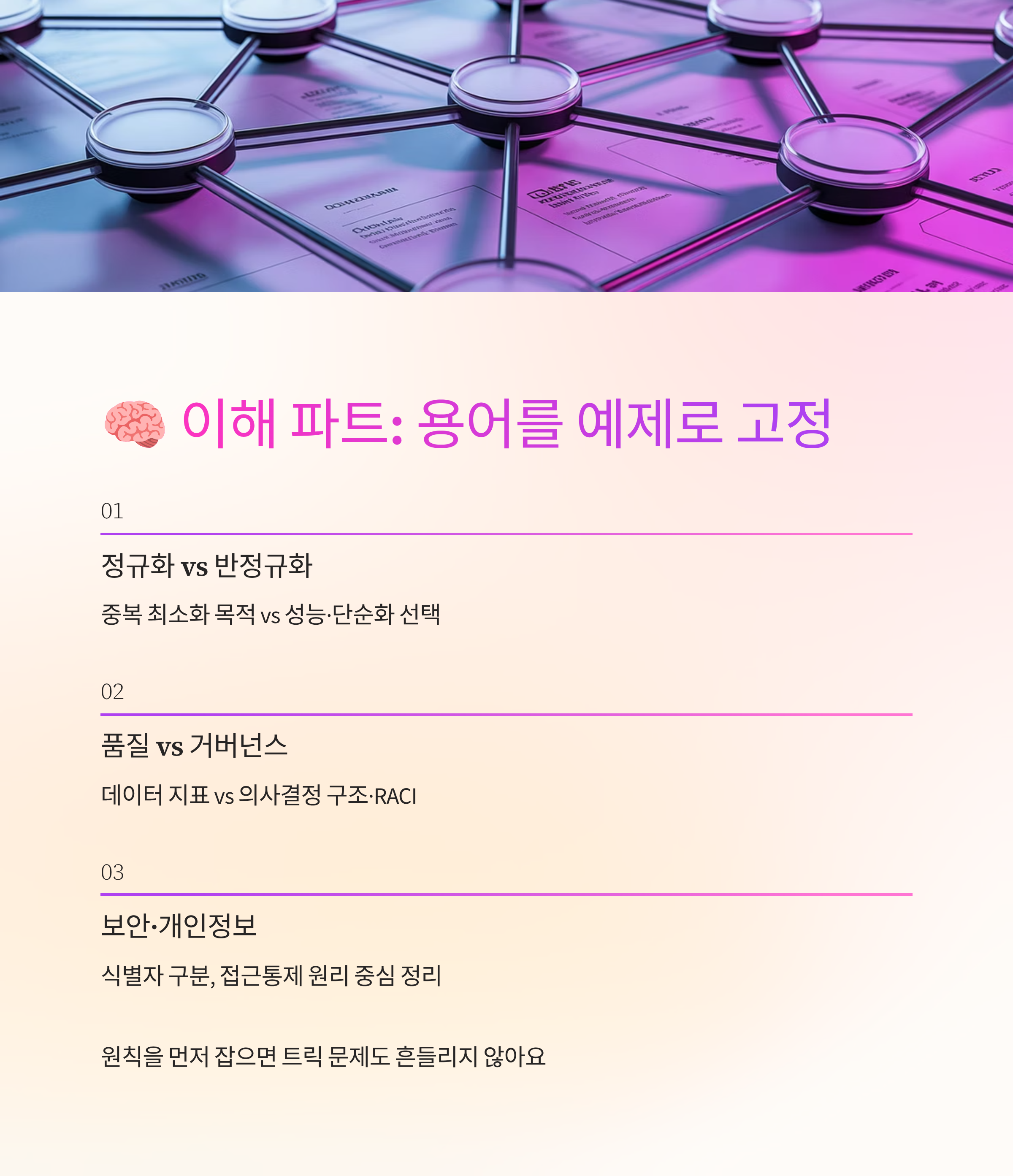 암기보다 ‘왜’를 먼저 잡아요. 예를 들어 정규화는 중복 최소화가 목적이고, 반정규화는 성능·단순화를 위한 선택이죠. 이렇게 대비를 적어두면 사소한 트릭 문제도 흔들리지 않아요.