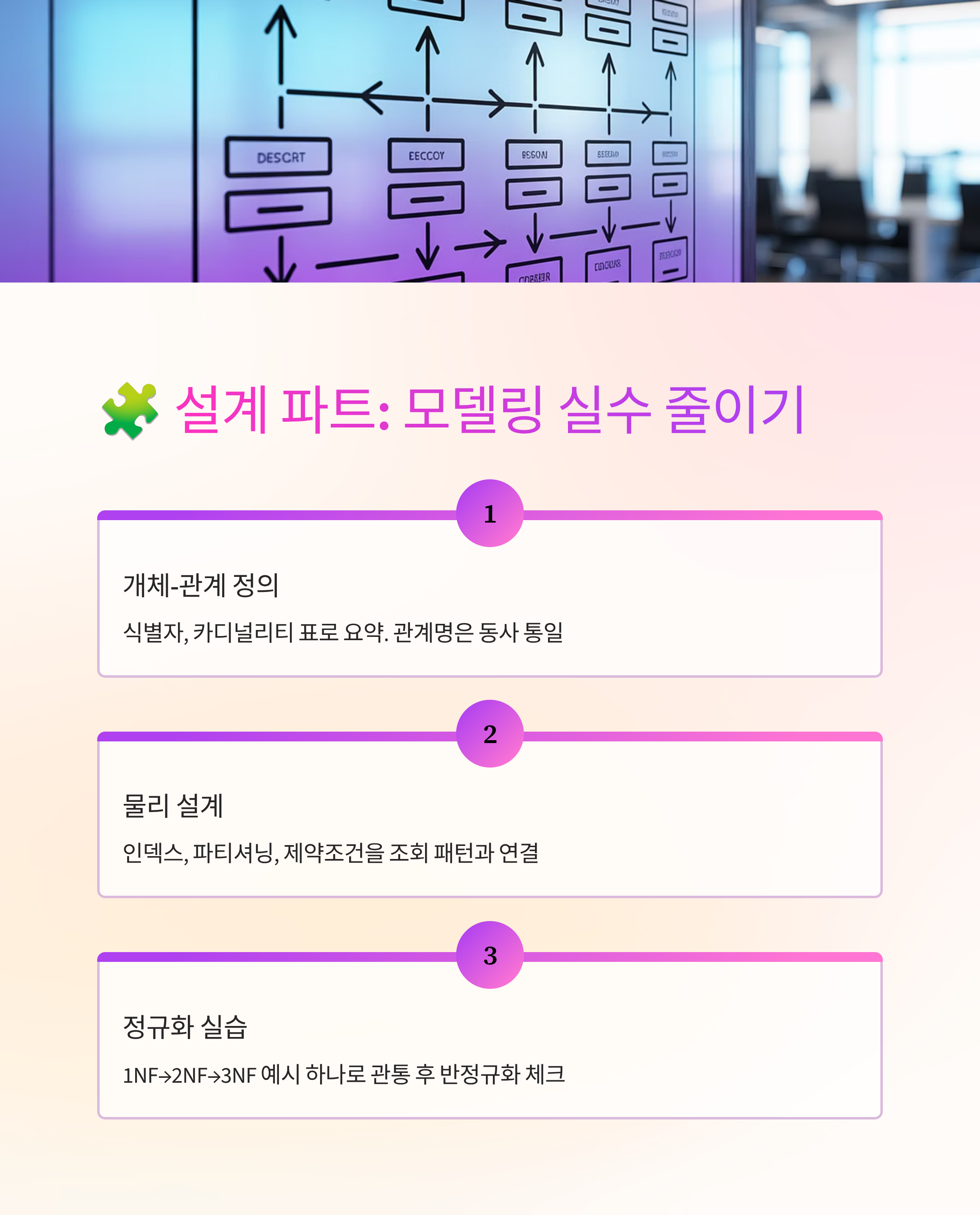 모델링은 개념→논리→물리 순서로 사례를 하나 정해 끝까지 밀어보세요. 정규화 단계, 식별자 선정, 인덱스·파티션 같은 구현 요소를 한 화면에 요약하면 연결이 선명해져요.