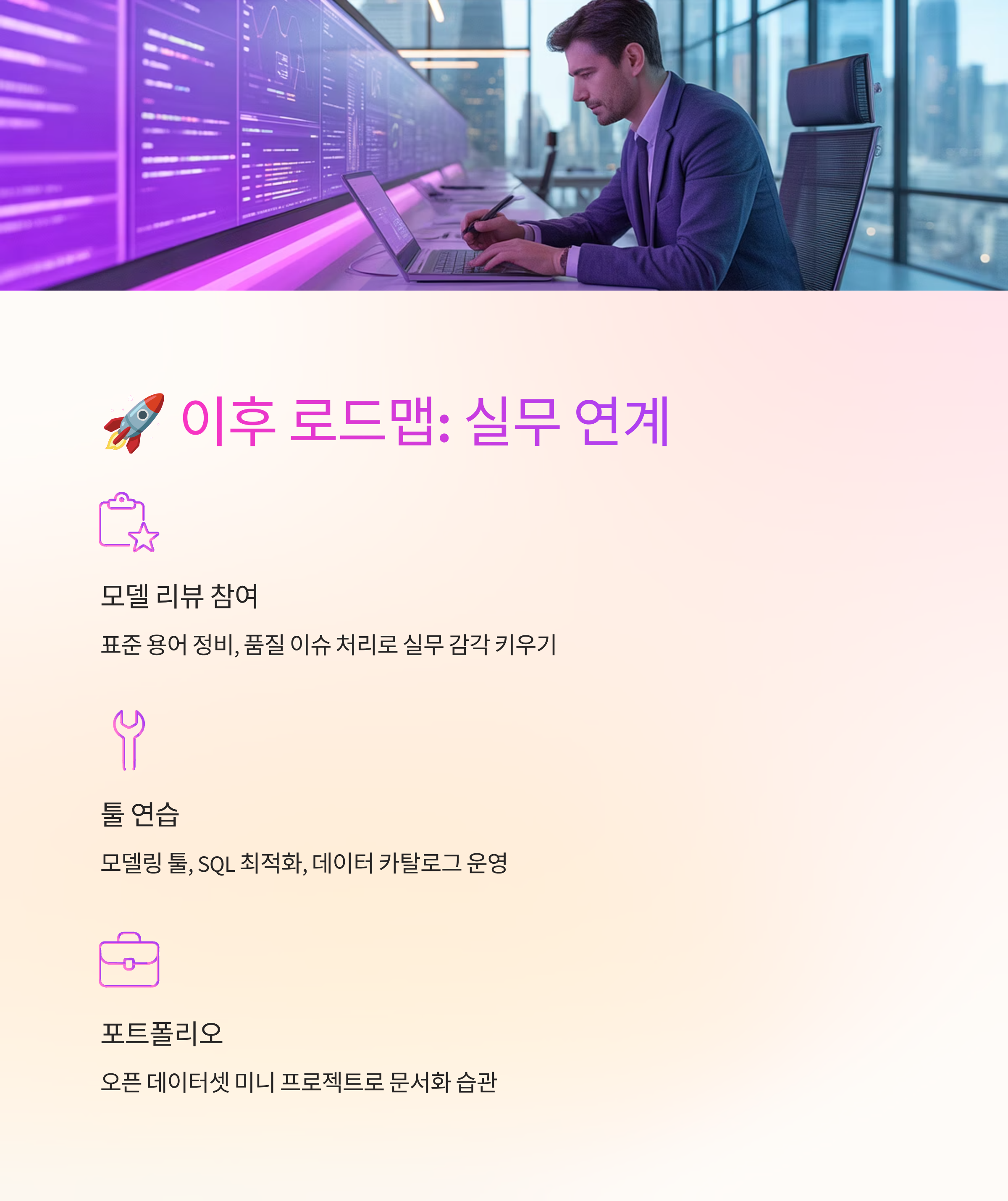 자격 취득이 끝이 아니에요. 모델 리뷰 참여, 표준 용어 정비, 품질 이슈 티켓 처리 같은 작은 과제부터 시작해 보세요. 문서화 습관을 들이면 팀 내 신뢰가 빨리 쌓여요.