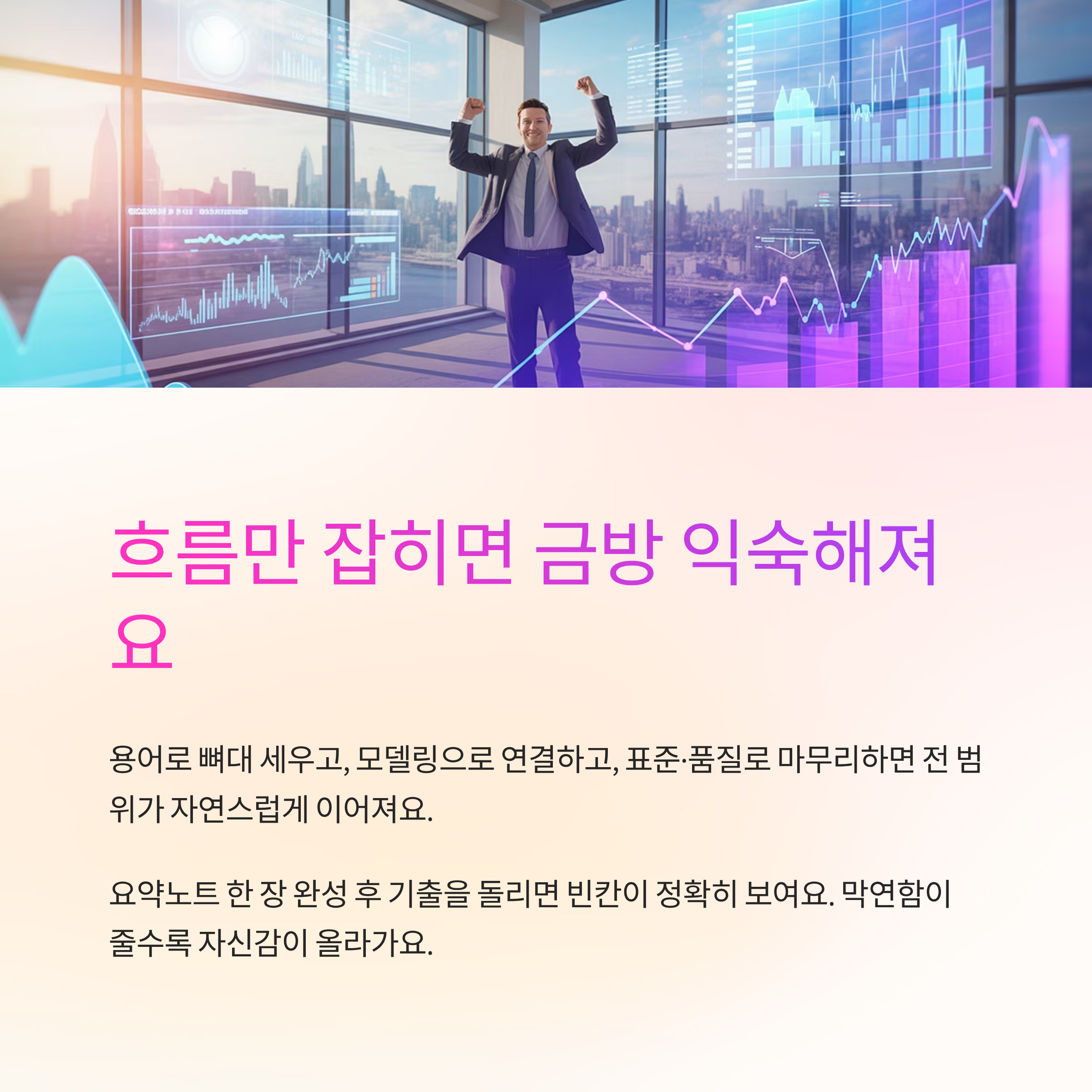 넓어 보이는 영역도 흐름만 잡히면 금방 익숙해져요. 용어로 뼈대를 세우고, 모델링으로 연결하고, 표준·품질로 마무리하면 전 범위가 자연스럽게 이어져요. 오늘 만든 틀로 요약노트를 한 장만 먼저 완성해 보세요. 그다음 기출을 돌리면 빈칸이 정확히 보이고, 남은 시간엔 그 빈칸만 메우면 돼요. 막연함이 줄어들수록 자신감이 눈에 띄게 올라가요.