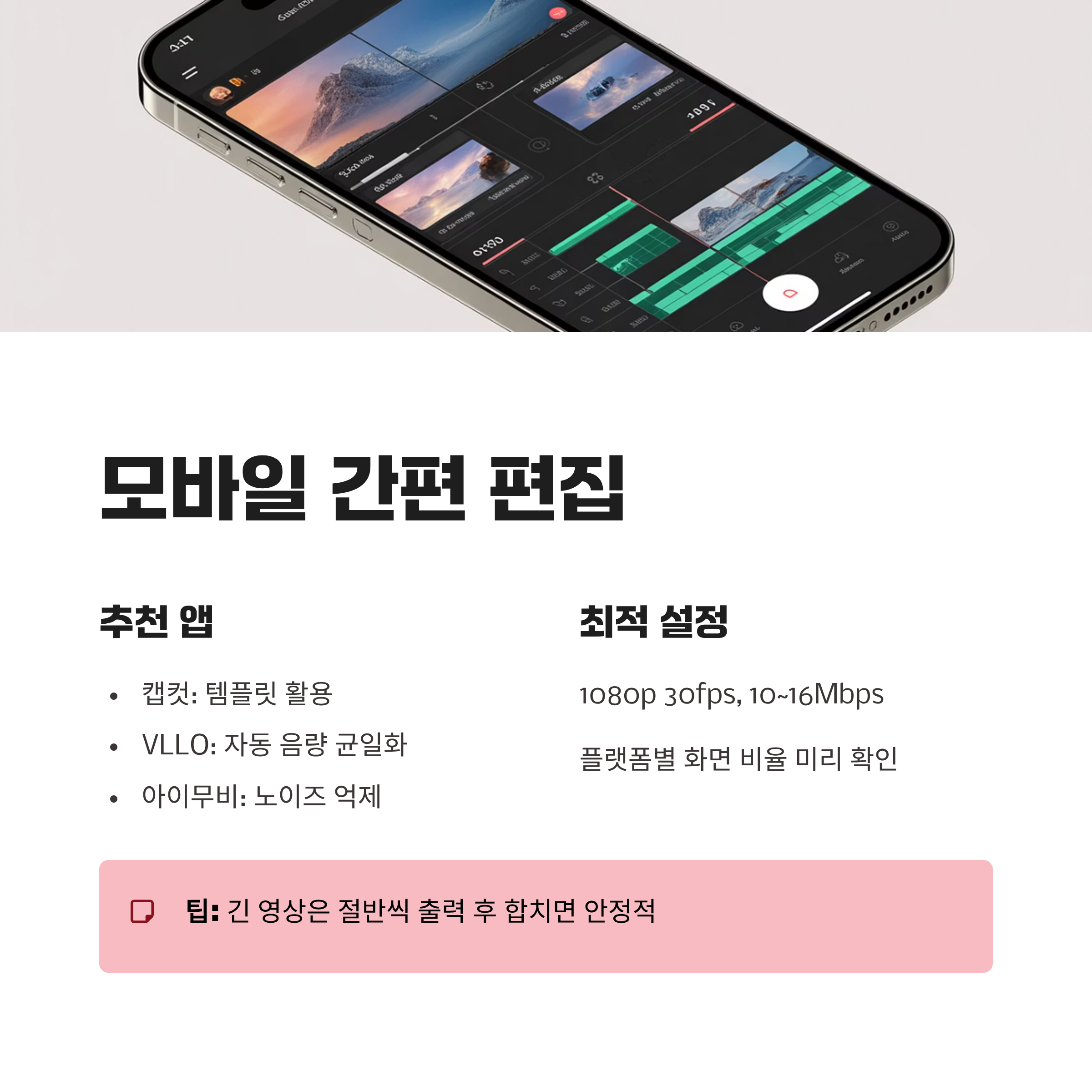 내보내기는 1080p 30fps, 10~16Mbps가 안전하고, 저장 전 미리보기에서 카카오톡·인스타 릴스 같은 가상 화면 비율로 한 번 확인해요. 플랫폼별 크롭이 달라서 상하단이 잘리는 일이 있거든요. 이렇게만 챙기면 휴대폰만으로도 동영상합치기 퀄리티가 꽤 안정적으로 나와요.
