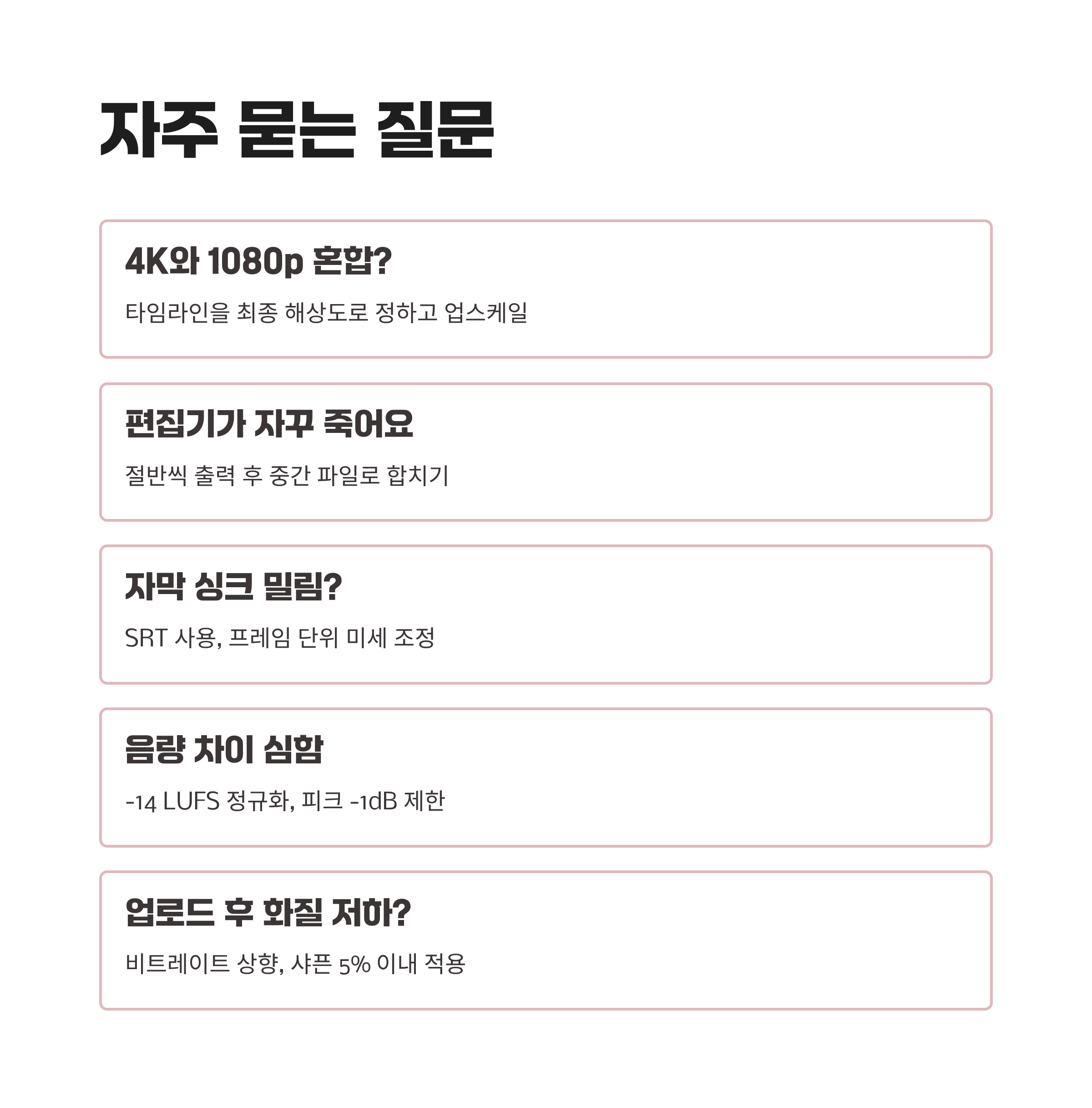 파일명은 날짜_프로젝트_v02처럼 규칙을 두고, 원본과 결과를 같은 폴더에 버전으로 쌓아 두면 추적이 쉬워요. 업로드 뒤 자동 압축으로 색이 탁해 보이면 대비를 3~5%만 올려 재업로드해 보세요. 이런 프리셋을 템플릿으로 묶어두면 다음 동영상합치기도 두세 번 클릭으로 끝나요.