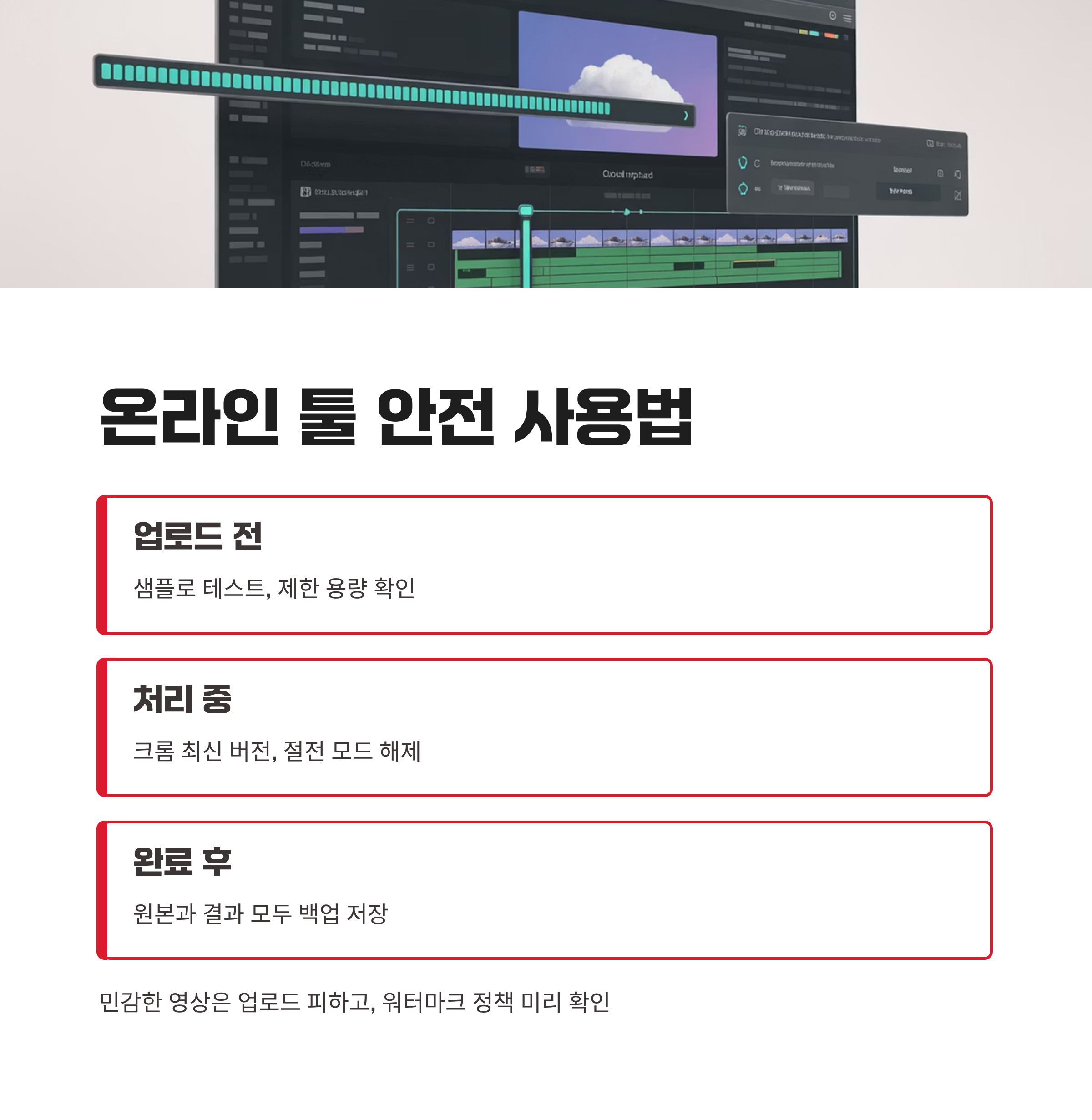 급할 땐 웹 기반 편집기도 유용해요. 다만 민감한 영상은 업로드를 피하고, 최대 업로드 제한과 자동 삭제 정책을 꼭 확인해요. 업로드 전 짧은 샘플로 테스트한 다음 본편을 올리면 실패 시간을 줄일 수 있어요. 처리 후에는 원본과 결과를 둘 다 내려받아 백업하세요. 이 정도만 지켜도 동영상합치기를 온라인에서 비교적 안전하게 처리할 수 있어요.