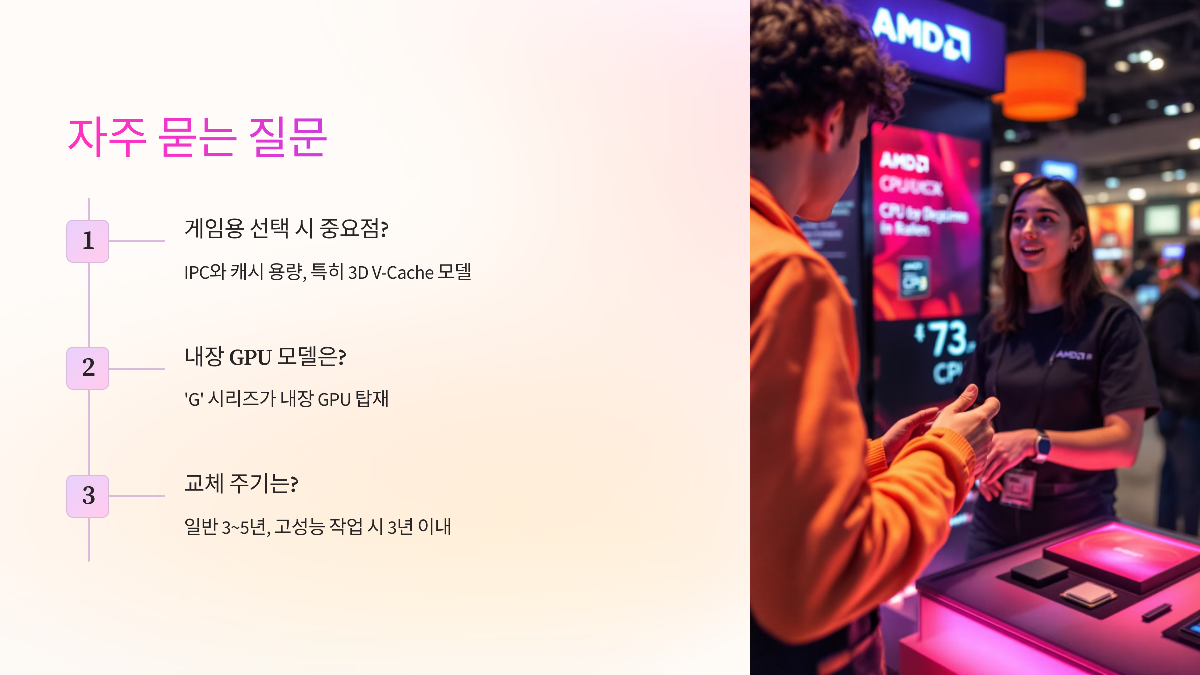A1: IPC와 캐시 용량이 중요하며, 특히 3D V-Cache 모델이 게이밍 성능에 효과적입니다.