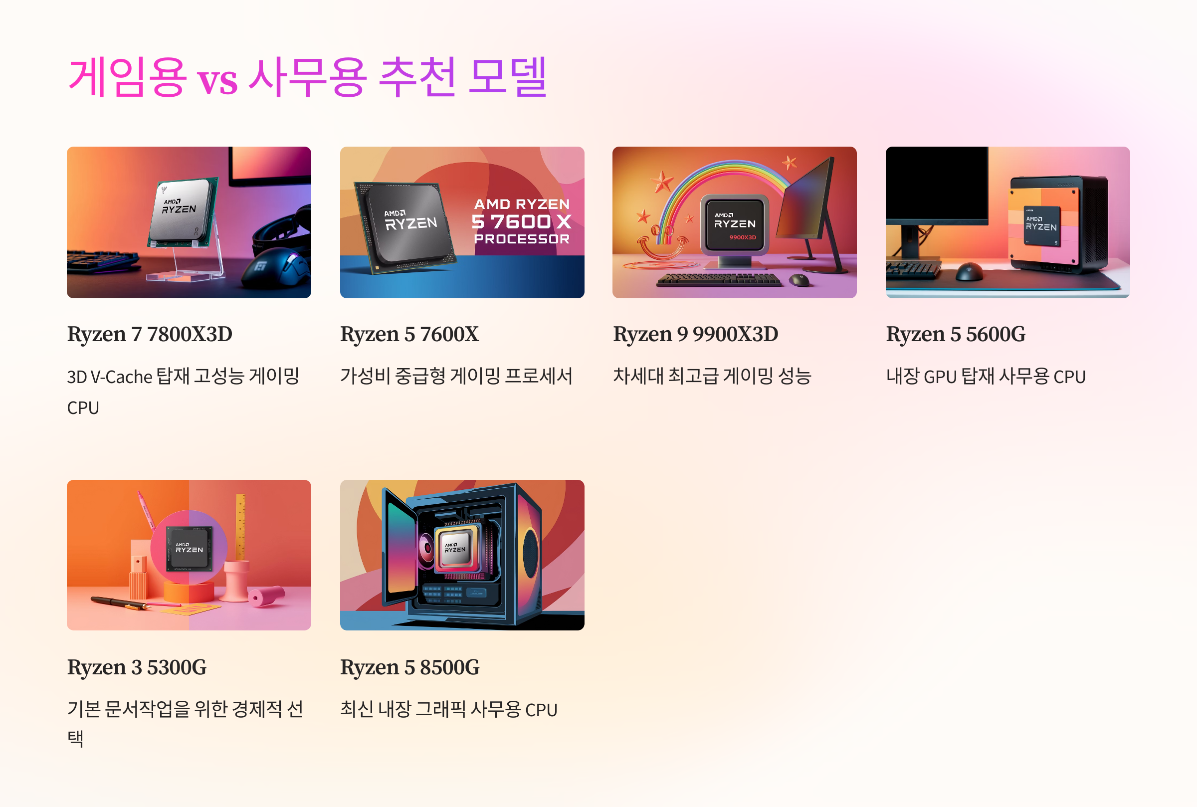 아래는 라이젠 CPU를 게임용과 사무용으로 나누어 성능과 가격 측면에서 가장 추천할 만한 모델을 비교한 내용입니다: