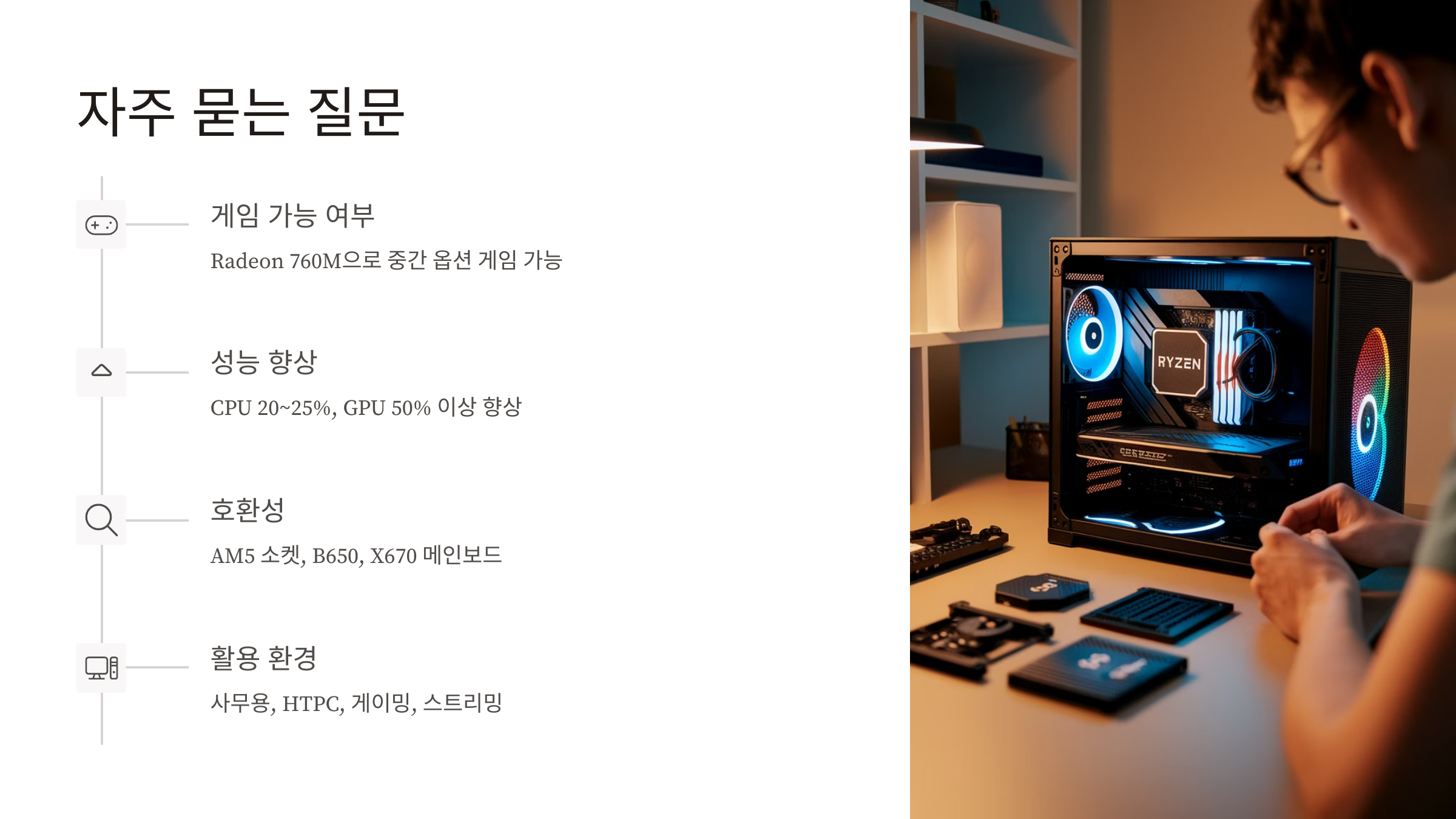 A4: 사무용, HTPC, 게이밍, 스트리밍용 등 다양한 환경에서 사용 가능하며, 별도의 GPU 없이도 효율적인 시스템 구축이 가능합니다.