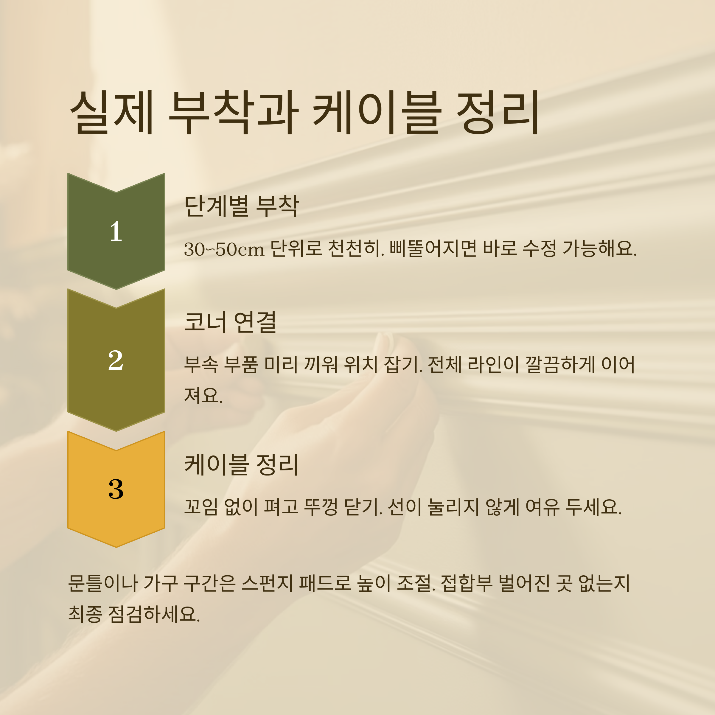 부착이 끝나면 전체 라인을 한 번 쭉 따라가며, 접합부가 벌어진 곳이나 끝부분이 날카롭게 튀어나온 곳이 없는지 체크하는 게 좋아요. 필요하면 사포로 모서리를 살짝 다듬어 주거나, 실리콘으로 마감해 틈새를 정리할 수도 있거든요. 이 정도까지 정리해 두면, 겉으로 보기에는 처음부터 벽과 함께 시공된 것처럼 자연스러운 배선 라인이 완성돼요.