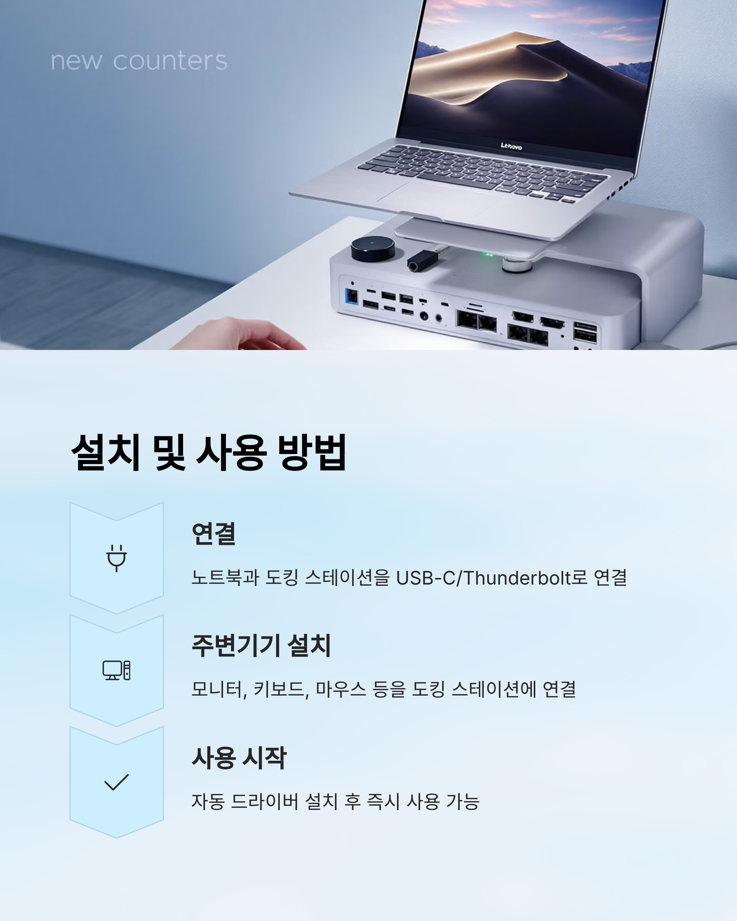 - 노트북과 도킹 스테이션을 USB-C 또는 Thunderbolt로 연결