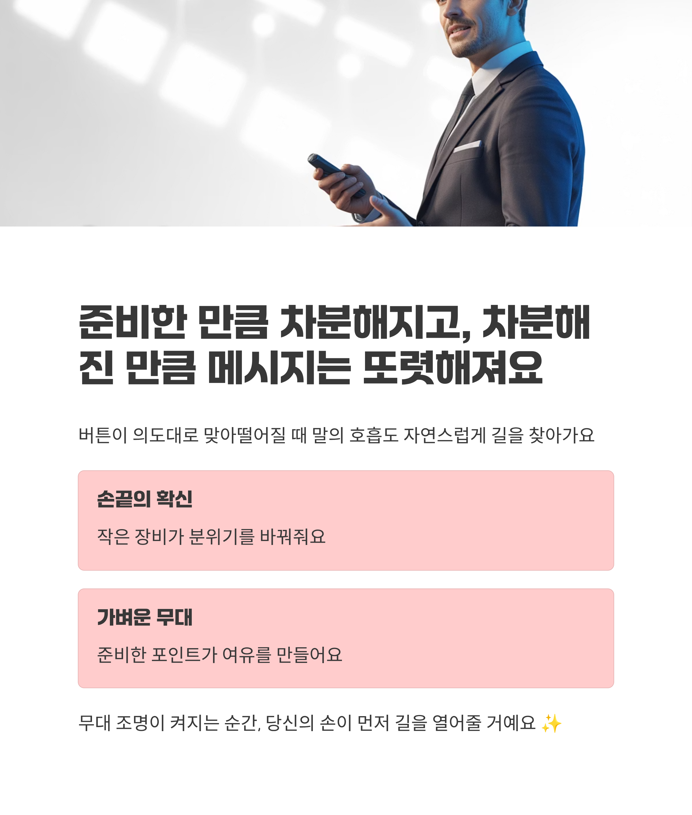 무대에 서는 일은 늘 떨리지만, 손끝에서 시작하는 작은 확신이 분위기를 바꿔줘요. 버튼이 내 의도대로 딱딱 맞아떨어질 때, 말의 호흡도 자연스럽게 길을 찾아가요. 준비한 만큼 차분해지고, 차분해진 만큼 메시지는 또렷해져요. 오늘 얘기한 포인트들을 가방에 하나씩 채워두면, 다음 발표는 분명 더 가벼울 거예요. 무대 조명이 켜지는 순간, 당신의 손이 먼저 길을 열어줄 거예요.