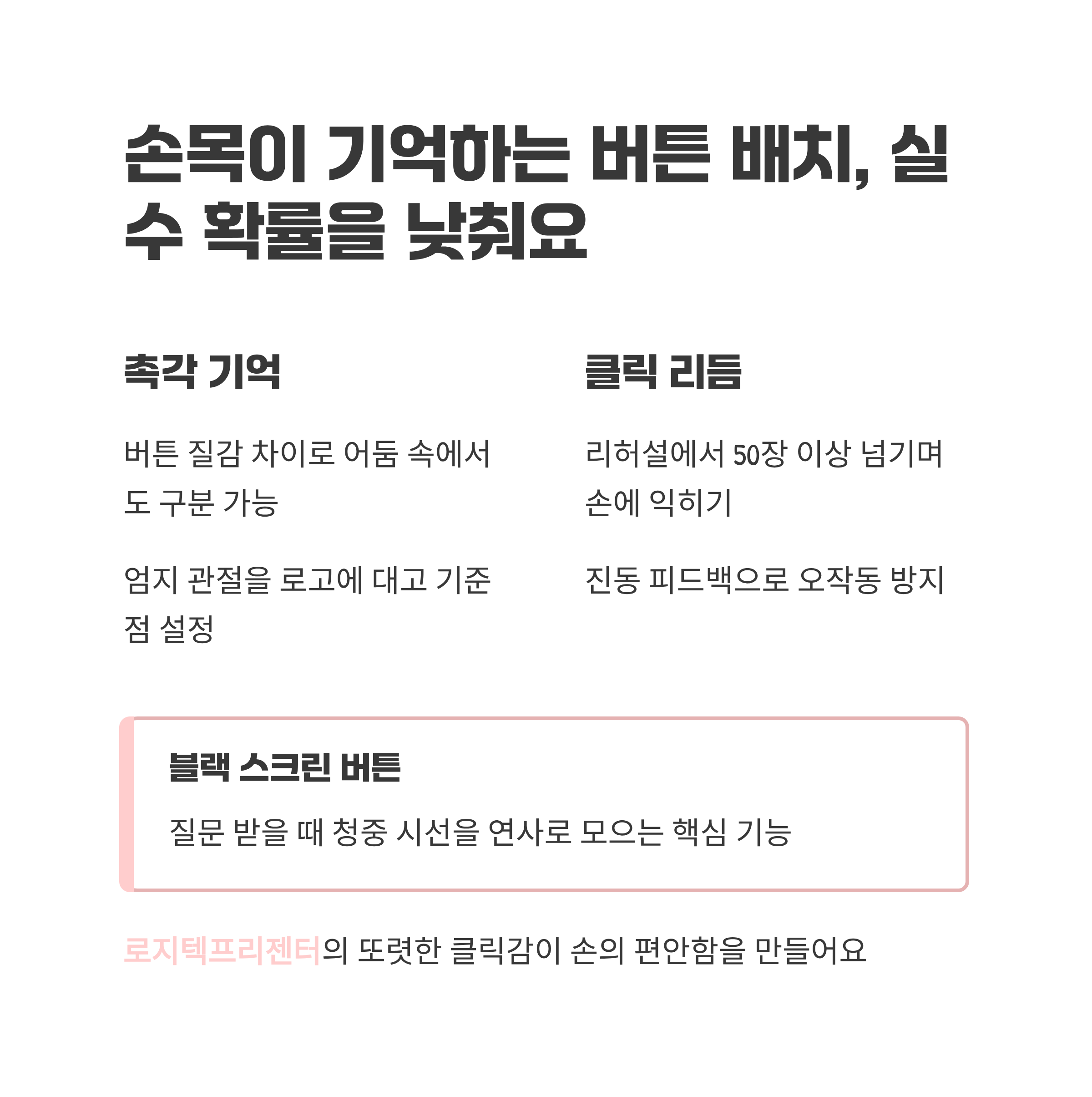 버튼은 손가락이 가장 먼저 만나는 인터페이스예요. 전환, 뒤로, 화면 블랙아웃 같은 핵심 기능은 엄지의 짧은 이동으로 도달되도록 배치돼 있으면 좋아요. 버튼 표면 질감이 서로 다르면 촉각만으로도 구분이 쉬워요. 리허설에서 슬라이드 50장 이상을 넘겨보며 클릭 리듬을 손에 익히면, 본 무대에서도 손목이 자동으로 움직여요.