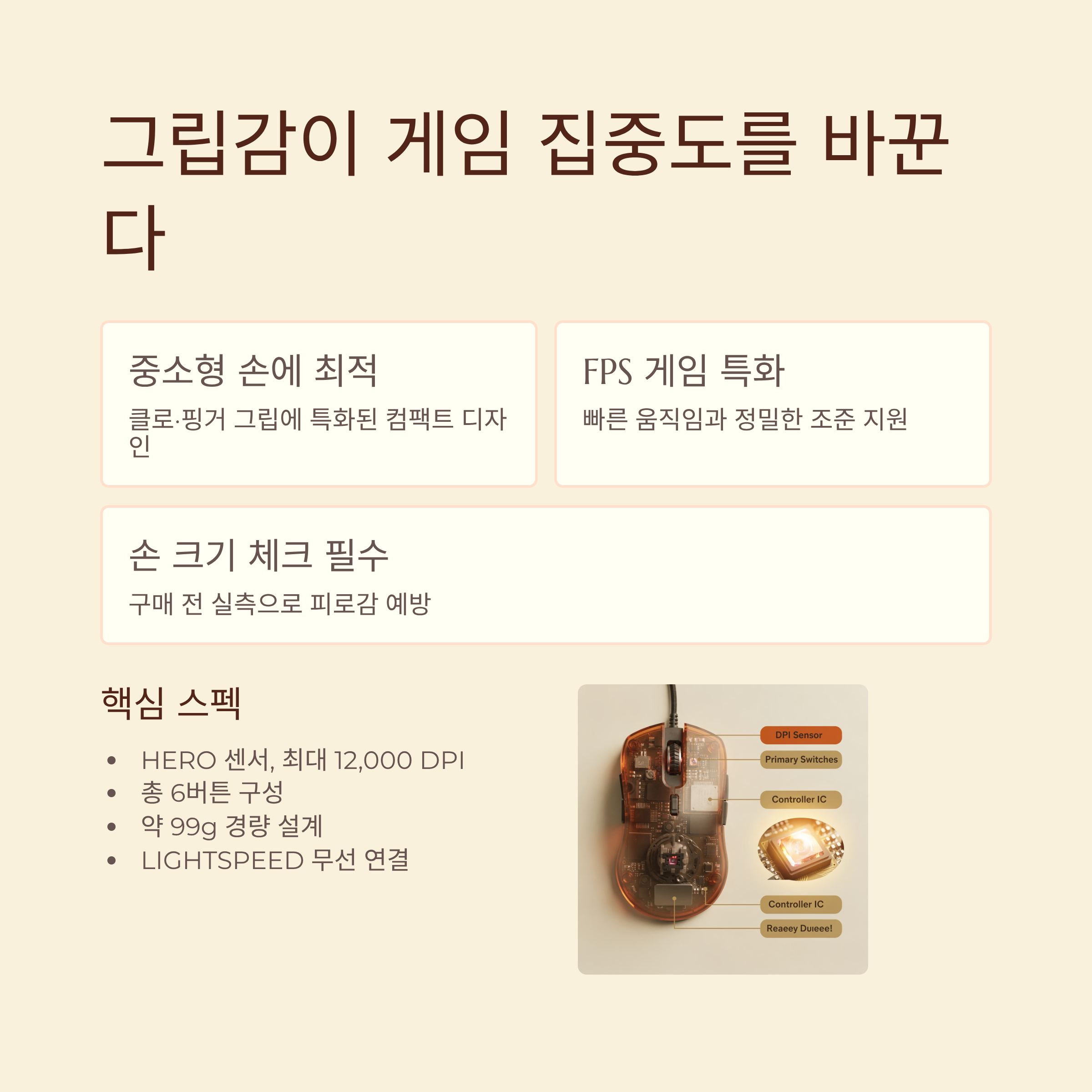 이 모델은 전체적으로 작은 편이라 손이 아주 큰 편보다는 중간 정도나 작은 손에 잘 어울리는 편이에요. 클로 그립이나 핑거 그립처럼 가볍게 쥐고 빠르게 움직이는 스타일에 특히 잘 맞아서, FPS 게임 즐기시는 분들이 많이 찾는 이유가 되기도 해요.