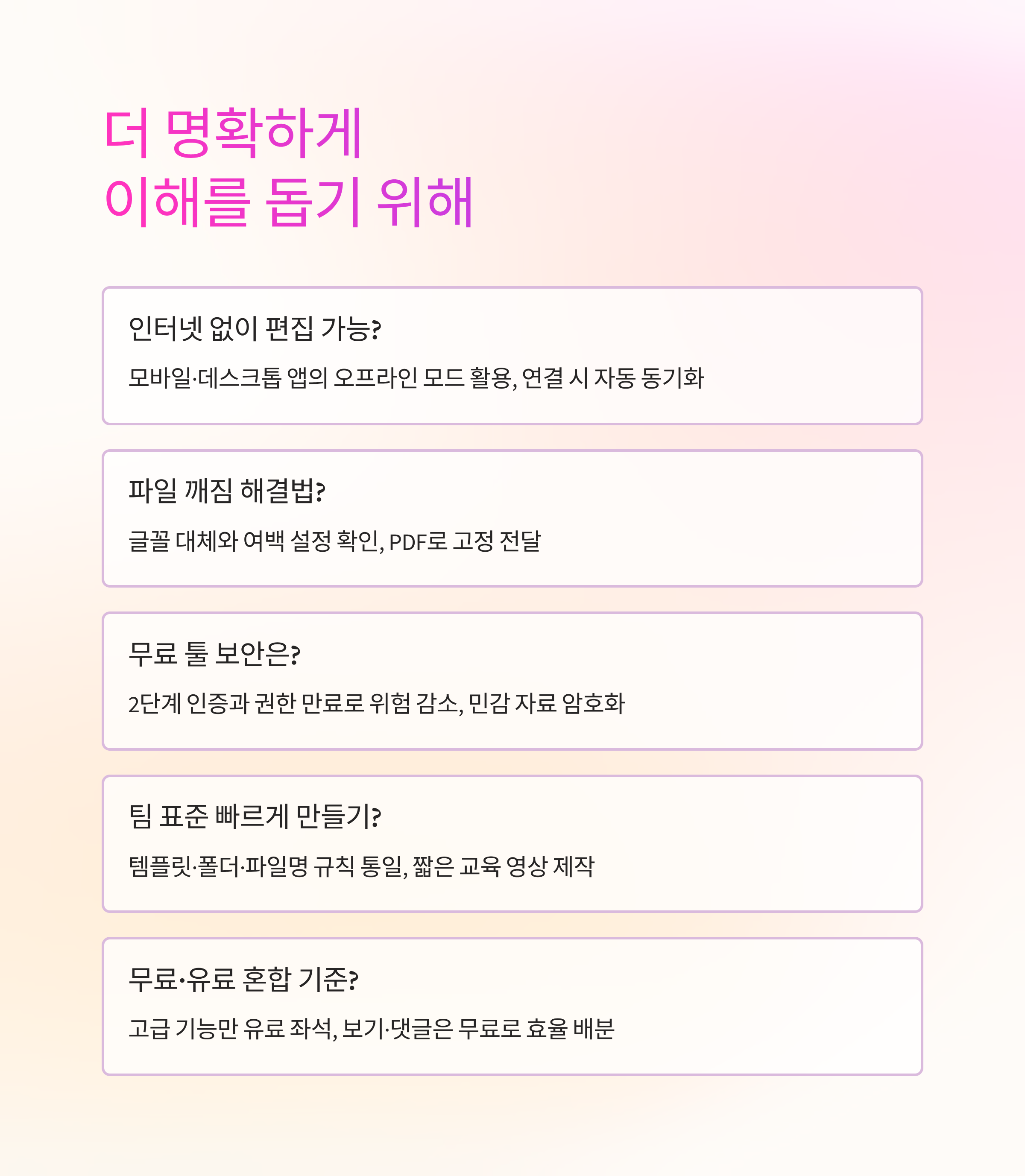 협업이 필요하면 공유 권한과 댓글, 변경 내용 기록을 확인하는 게 먼저예요. 링크 만료 설정과 보기 전용 옵션이 있으면 외부 전달이 훨씬 안전해요. 자동 저장 주기는 짧게, 파일명 규칙은 팀과 통일해두면 버전 충돌이 줄어들어요. 작은 습관이 전체 품질을 끌어올려요.