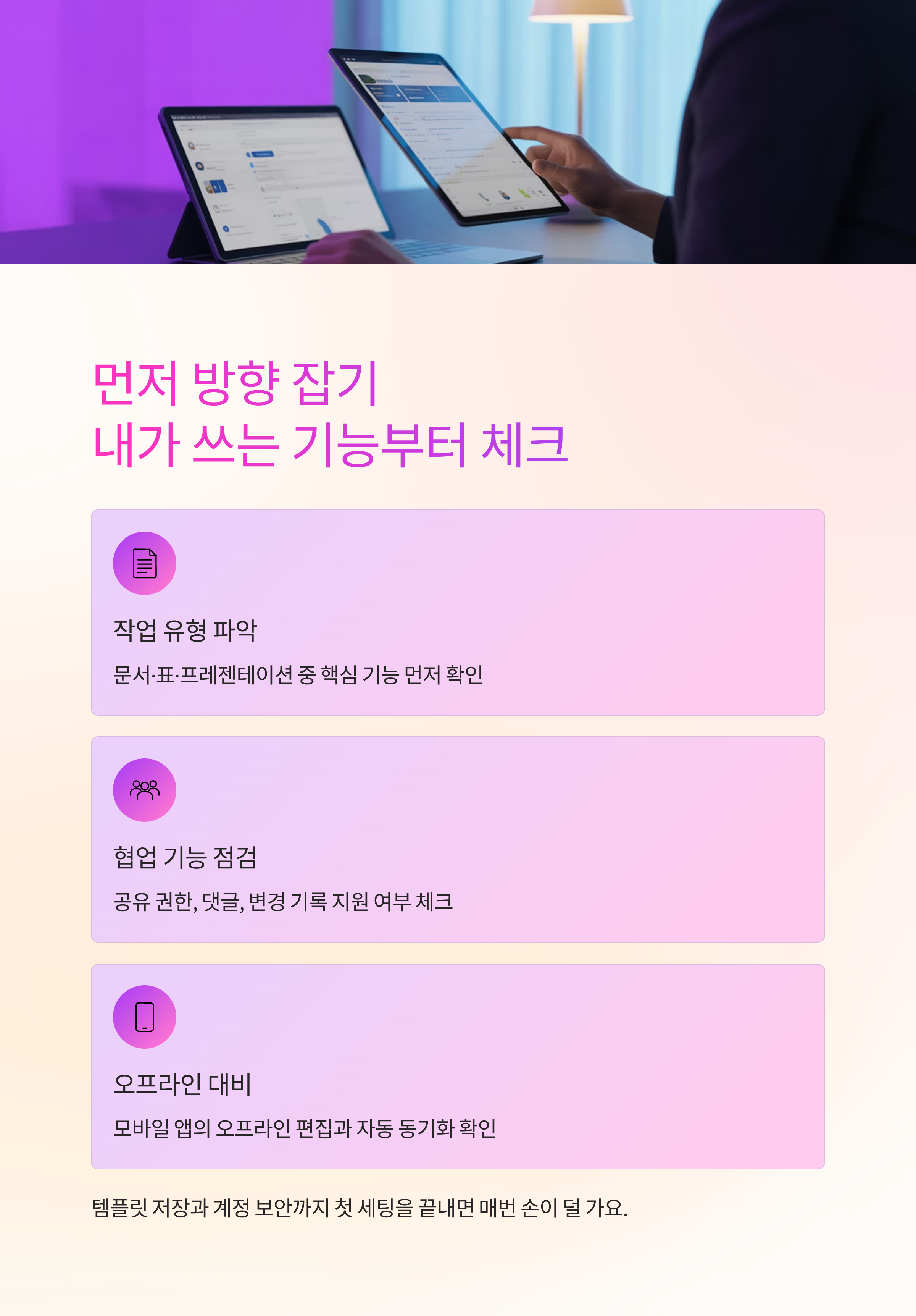 문서 작성이 전부인지, 표와 차트가 많은지, 프레젠테이션이 핵심인지 먼저 가려내면 선택이 쉬워져요. 웹에서 템플릿을 불러오고 글꼴만 맞춰도 대부분의 작업이 바로 돌아가요. 오프라인이 잦다면 모바일 앱의 오프라인 편집과 자동 동기화 지원 여부를 함께 봐주세요. 의외로 브라우저 확장만 정리해도 체감 속도가 꽤 좋아져요.