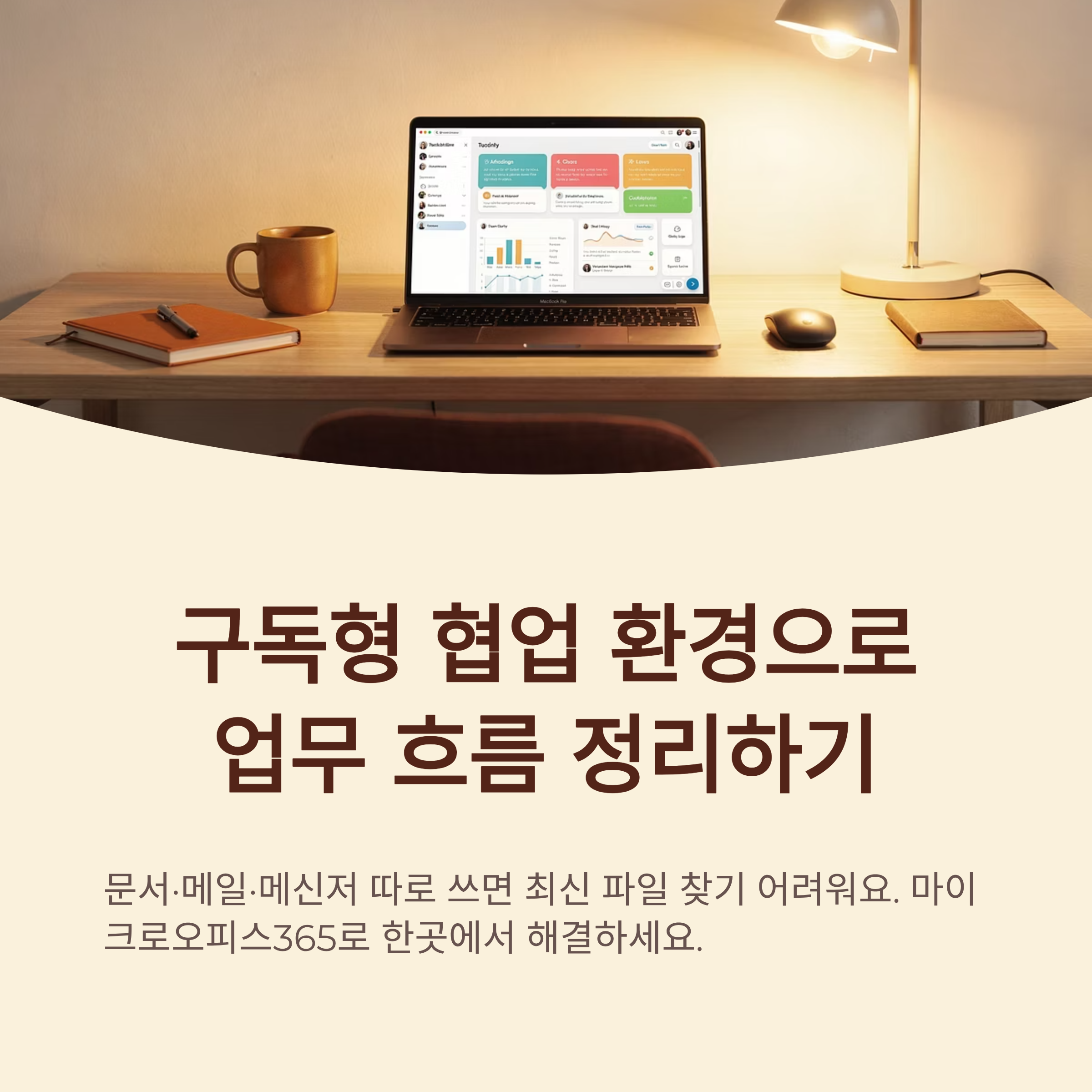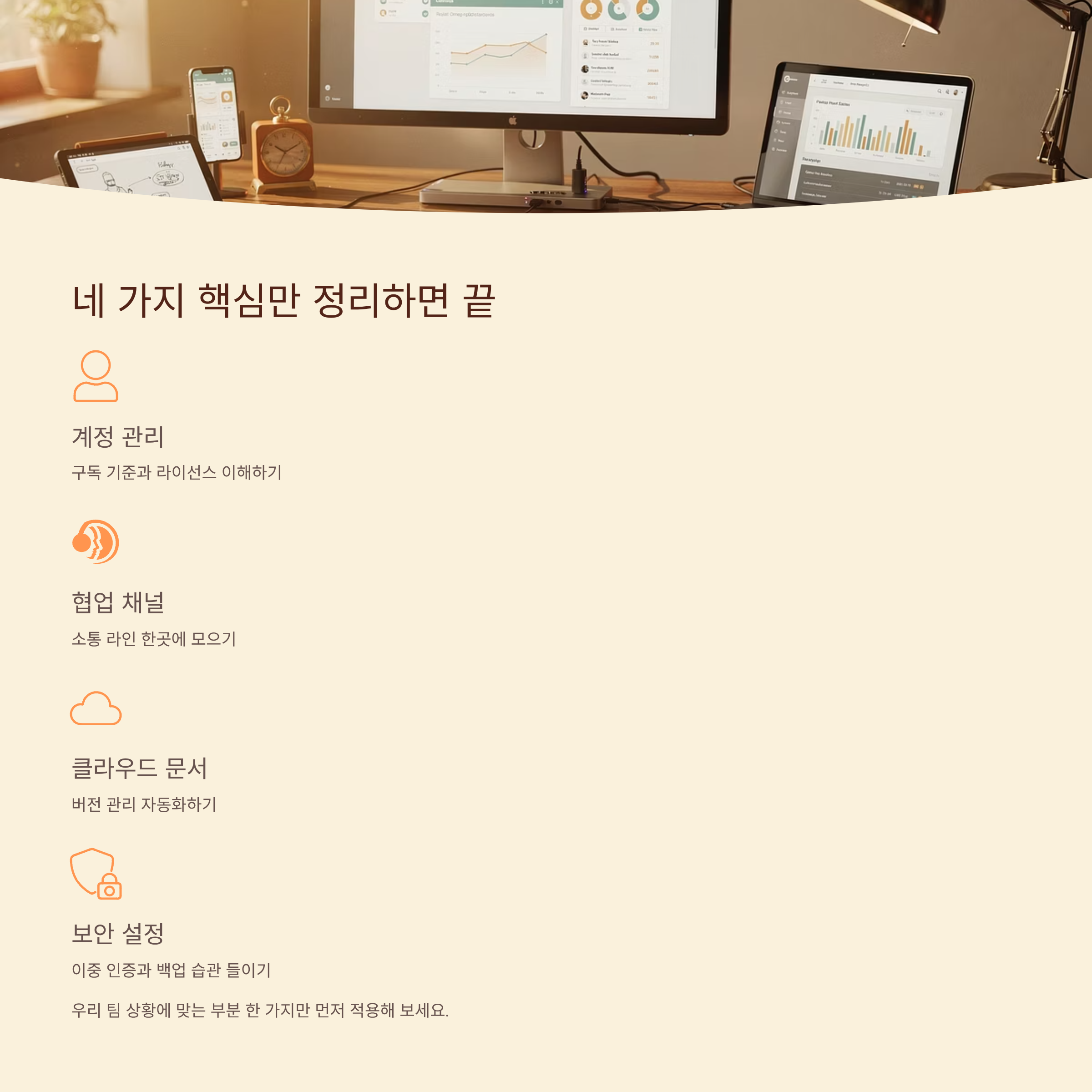 익숙한 프로그램이라도 구독 방식으로 바뀌면 처음에는 괜히 어려워 보일 수밖에 없어요. 그래도 계정 관리, 협업 채널, 클라우드 문서, 보안 설정 이 네 가지만 차근차근 정리해 두면 전체 구조가 훨씬 또렷하게 그려지더라고요. 오늘 이야기한 내용 중에서 우리 팀 상황에 맞는 부분 한 가지만 먼저 적용해 보시면, 업무 흐름이 조금씩 정리되면서 다른 기능들도 훨씬 자연스럽게 손에 익을 거예요.