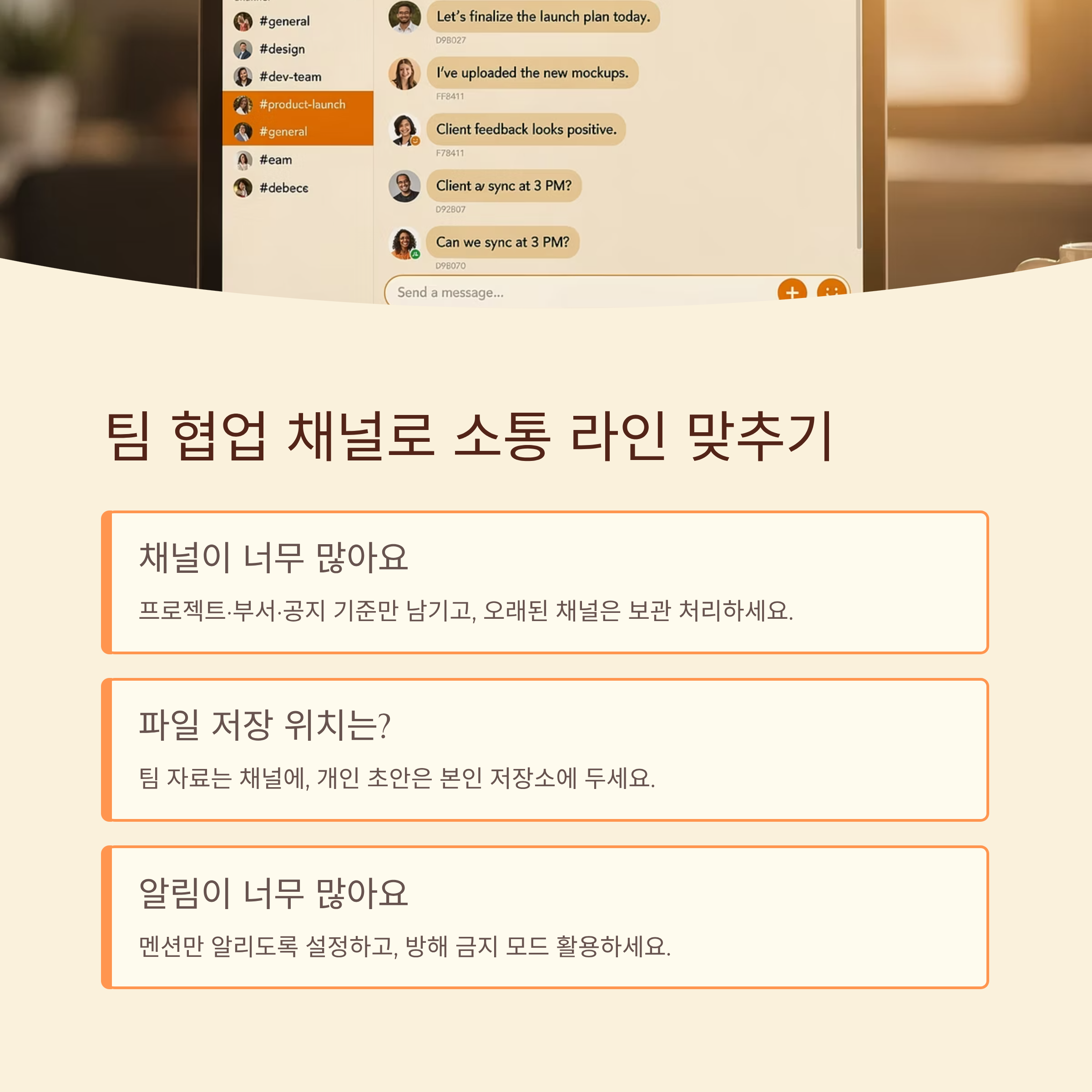 | Q. 채널이 너무 많아져서 정리가 안 돼요. | A. 프로젝트·부서·공지 정도의 큰 기준만 남기고, 오래된 채널은 보관 처리해서 목록을 가볍게 만드는 게 좋아요. |
