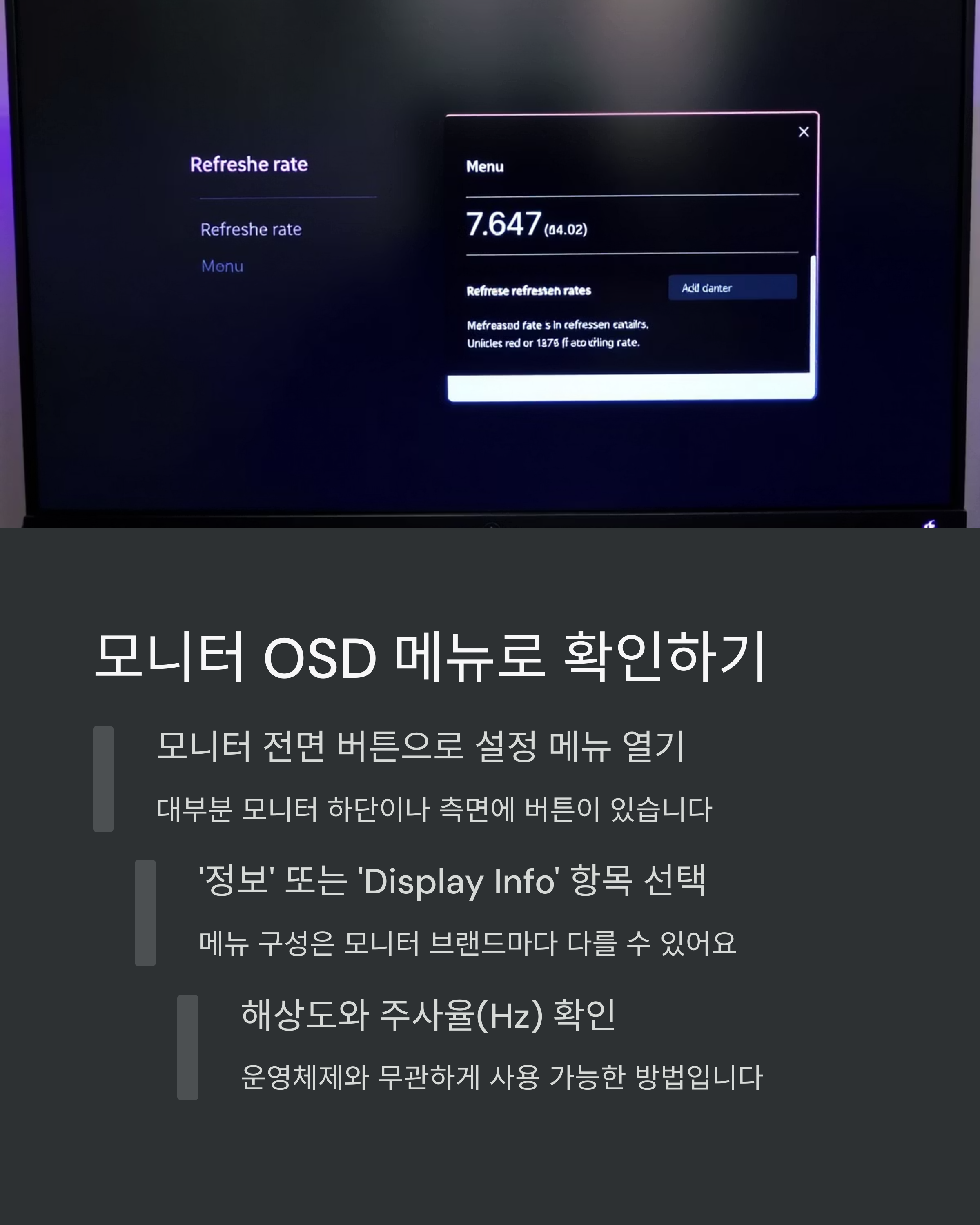 대부분의 모니터는 자체 OSD(화면상 디스플레이) 메뉴를 통해 주사율을 보여줘요.